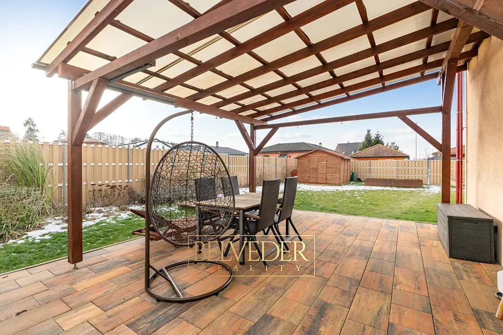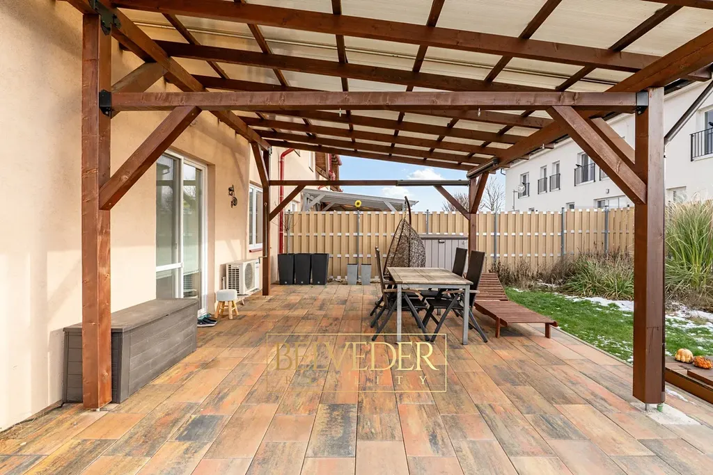 O příjemné vnitřní klima se stará klimatizace v obývacím pokoji, která zajišťuje vytápění celého bytu. Díky kvalitnímu zateplení domu je bydlení energeticky úsporné a provozně nenáročné. Velkým benefitem je prostorná terasa o výměře 40 m² s pergolou o velikosti 25 m², které poskytují ideální prostor pro rodinná posezení, grilování nebo oslavy. Zahrada o celkové výměře 184 m² nabízí dostatek místa pro dětské hry, bazén, trampolínu i klidnou relaxaci.