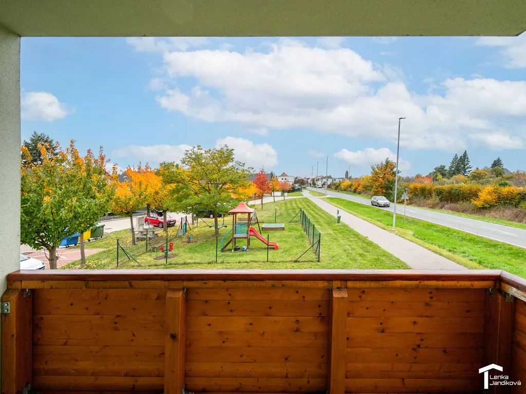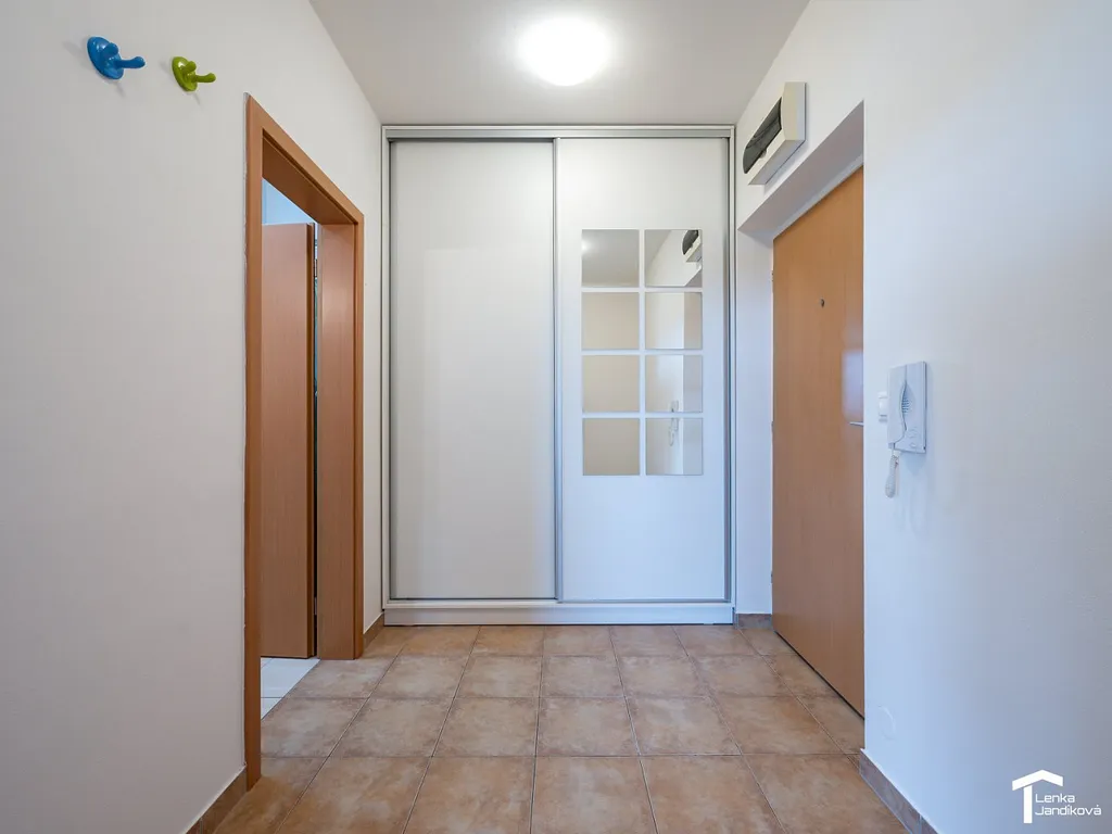 Po vstupu do bytu se ocitáme v prostorné chodbě, kde je k dispozici vestavěná šatní skříň. Z chodby vejdeme do koupelny. Ta je spojená s WC a je osazena sprchovým koutem. Z chodby vstoupíme do světlého prostorného obývacího pokoje, na který navazuje kuchyňský kout. Kuchyňská linka má vestavěnou elektrickou varnou desku, elektrickou troubu, vestavěnou lednici s mrazákem a mikrovlnnou troubu a bude zde osazena nová myčka. Z obývacího pokoje je vstup do ložnice, ze které vejdeme na lodžií. Majitelé nechají do oken nainstalovat žaluzie.