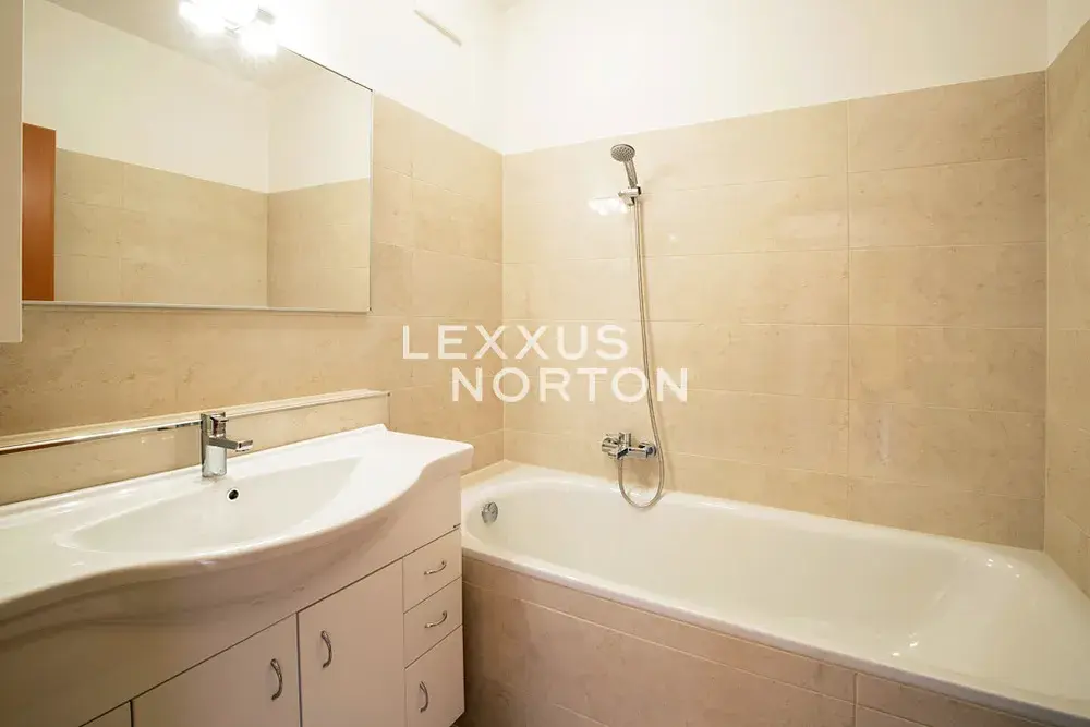 Byt disponuje moderním kuchyňským koutem vybaveným sporákem, troubou, myčkou nádobí a mikrovlnnou troubou. K dispozici jsou dvě koupelny - jedna se sprchovým koutem a toaletou, druhá s vanou.