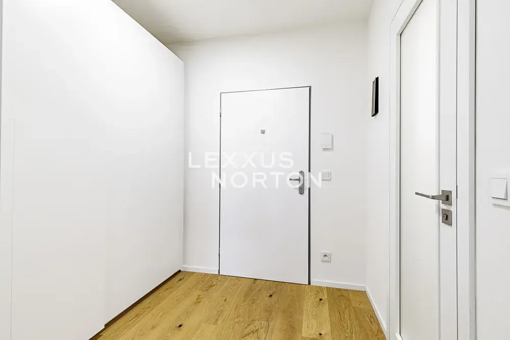 Dispozice bytu zahrnuje vstupní chodbu, prostorný obývací pokoj s kuchyňským koutem a přímým vstupem na velkou terasu o výměře 27,6 m2, samostatnou ložnici a koupelnu s toaletou. Součástí nájemného je také garážové stání.