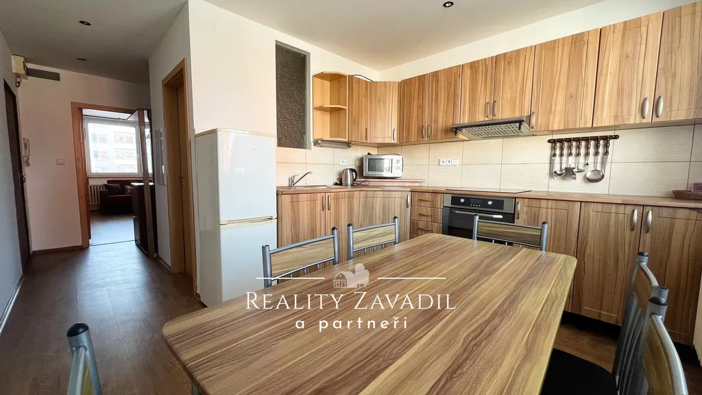 Z chodby vedou vstupy do obou hlavních místností. Po levé straně vejdete do prostorného obývacího pokoje, který působí velmi útulným dojmem. Je vybaven obývací stěnou, televizí, konferenčním stolkem a sedací soupravou s křesly. Vydáte-li se chodbou doprava, vstoupíte do samostatné kuchyně. Zde se nachází rohová kuchyňská linka s dostatkem úložného prostoru, elektrickým sporákem s troubou, digestoří a mikrovlnnou troubou. K dispozici je i jídelní stůl se židlemi. (Poznámka: Byt se pronajímá bez chladničky).