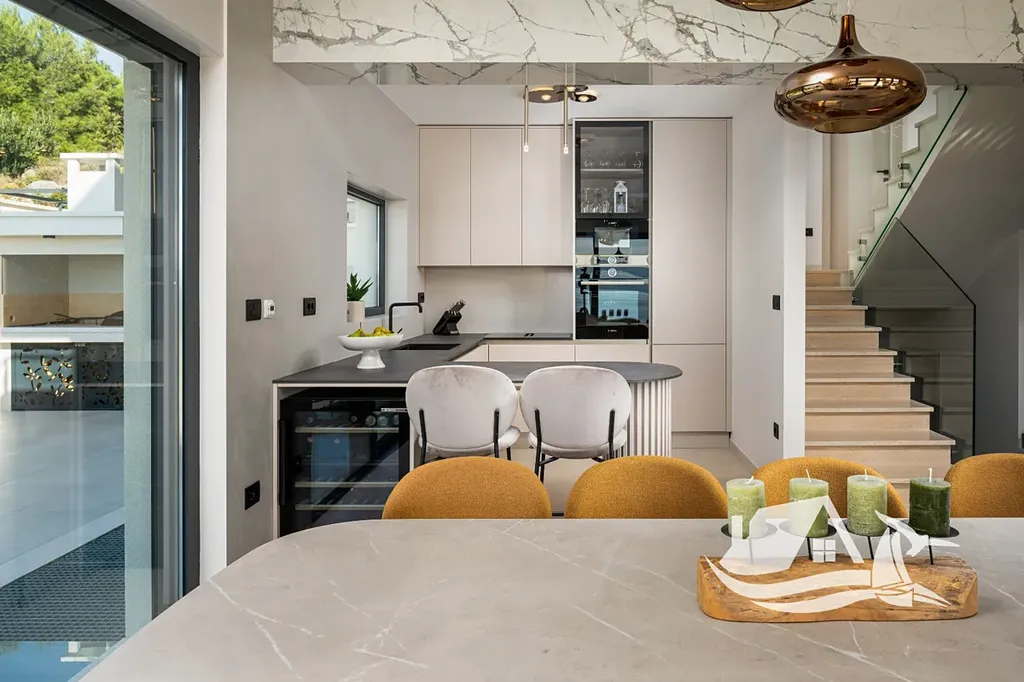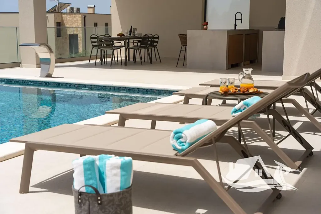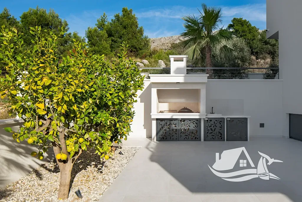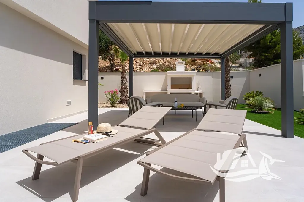 Součástí vily je bioklimatická pergola, která poskytuje stín i ochranu před povětrnostními vlivy, a venkovní kuchyně s plynovým grilem, ideální pro středomořský životní styl. Dům je navržen tak, aby byl komfortní jak pro celoroční bydlení, tak pro intenzivní sezónní využití.