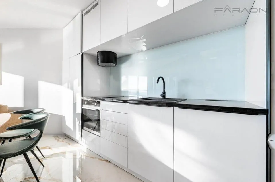 Dispozici 2+kk (61,5 m) tvoří vstupní chodba s rolldory a úložným prostorem, designová kuchyně na míru se spotřebiči Siemens, Miele a Liebherr, jídelní kout a obývací pokoj s velkoformátovými okny, která zajišťují maximální slunné prosvětlení bytu. Koupelna je vybavena bezbariérovým sprchovým koutem, bidetovou sprškou u WC a ergonomicky řešenou pračkou se sušičkou, doplněnou špičkovou italskou keramikou a žulovou deskou. Byt se prodává kompletně zařízený, včetně postele s vyvýšenou matrací, designové pohovky Diemme pro 4 osoby, originálních uměleckých děl a moderních technologií klimatizace, smart TV, zabudovaného rádia, internetu a bezklíčového vstupu.