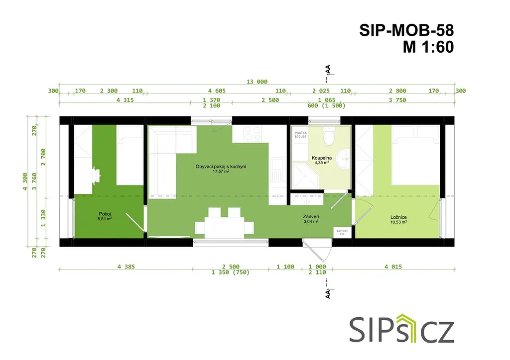 Dispozice: obývák s kuchyňským koutem 17,57m2, ložnice 10,53 m2, dětský pokoj 8,81m2, WC se sprchovým koutem 4,53 m2, vstupní chodba 3,04m2.