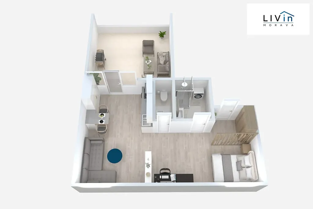 Byt se skládá z jednoho velkého obytného prostoru s kuchyňským koutem, terasy, koupelny a samostatného WC. Hlavní místnost má tvar písmene L a lze ji dispozičně rozdělit na obývací část a ložnici. Byt se pronajímá jako částečně vybavený, součástí je šatní skříň a komoda. Kuchyňská linka je vybavena vestavnými spotřebiči – lednicí s mrazákem, horkovzdušnou troubou, indukční varnou deskou a digestoří. Součástí kuchyně je také barový pult s barovými židlemi. V koupelně se nachází sprchový kout a přípojka na pračku. Odkup gauče, postele, barových židlí i pračky je možno dohodnout se současnou nájemkyní.