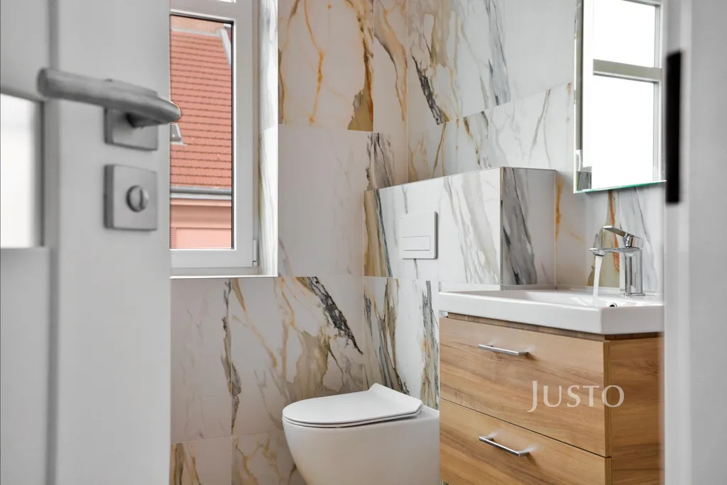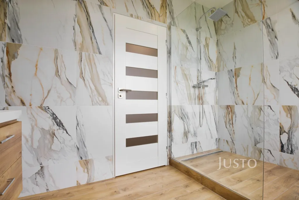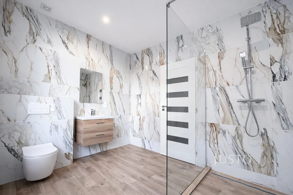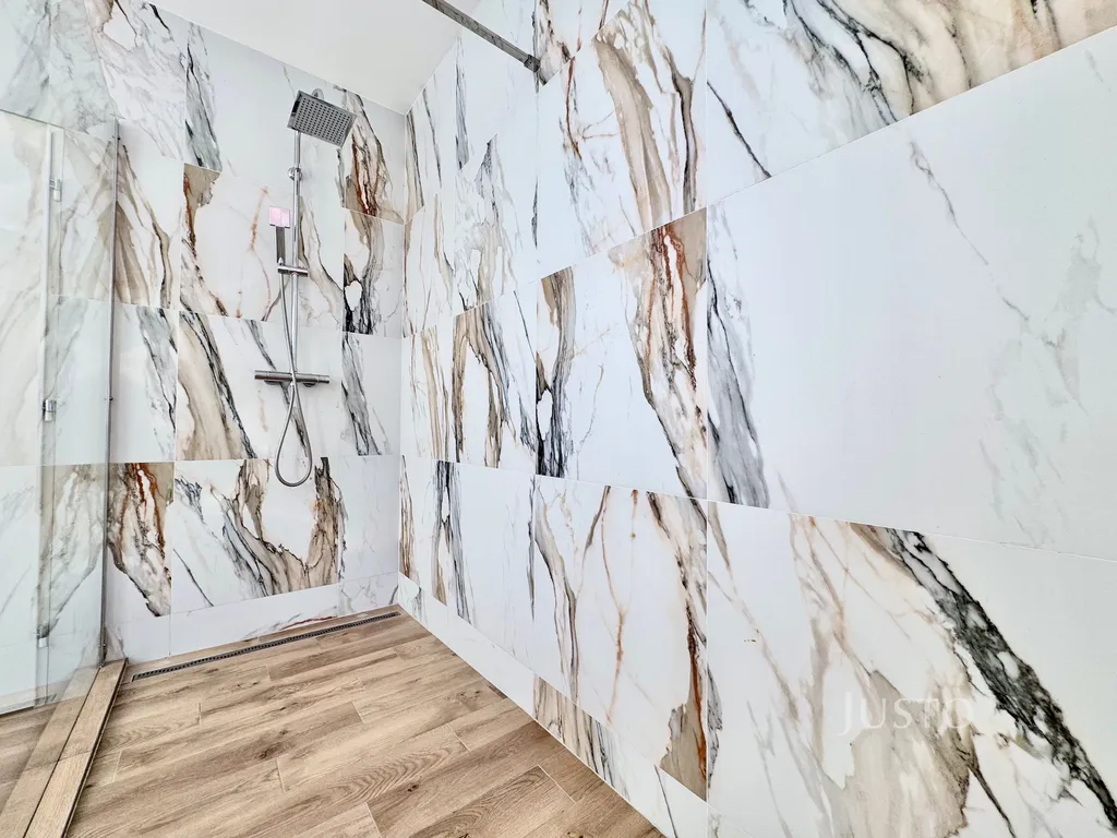 • Stylová koupelna: bezbariérový sprchový kout, závěsné WC, umyvadlo s úložným prostorem, velkoformátový obklad