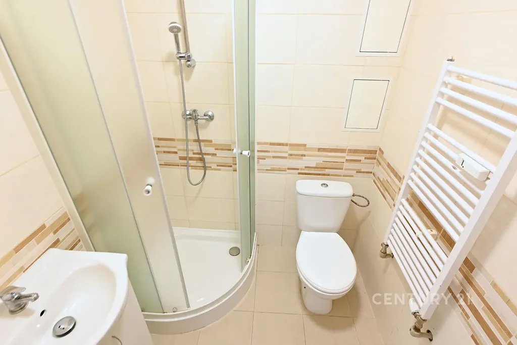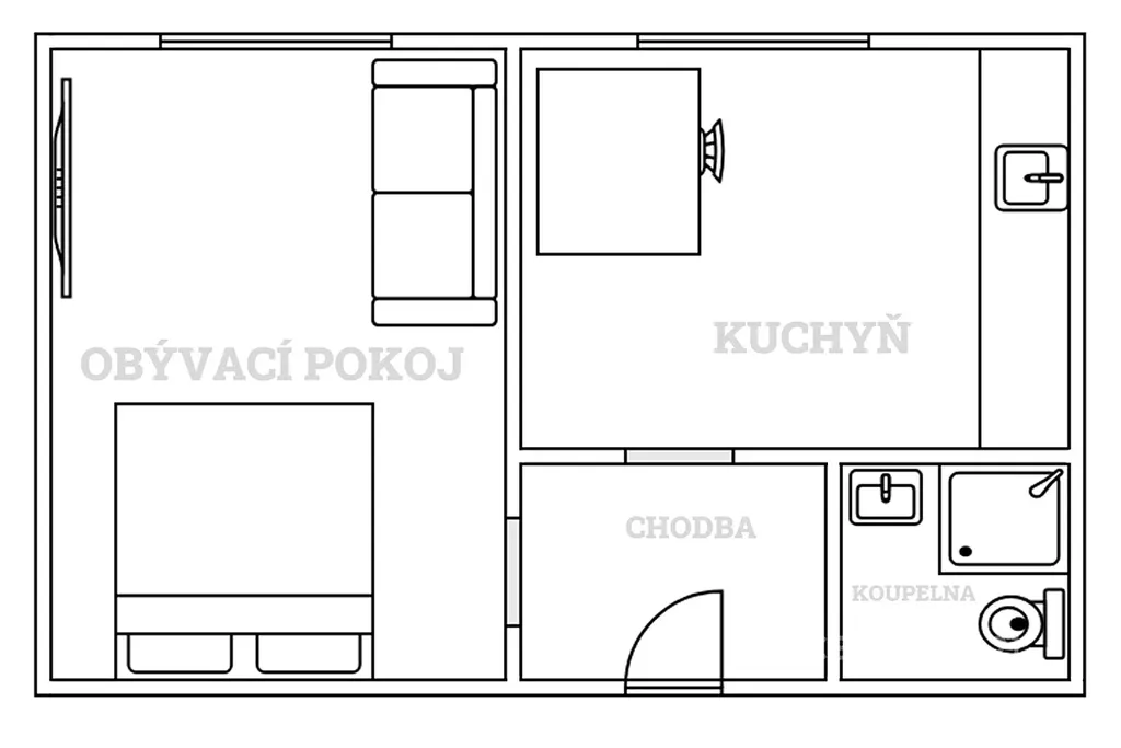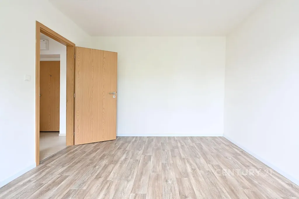 Jakmile vstoupíme dovnitř, máme po pravé straně koupelnu se sprchovým koutem, otopným žebříkem a WC. V kuchyni se nachází kuchyňská linka s elektrickou troubou, varnou deskou a digestoří. V samostatném pokoji a kuchyni je položena plovoucí podlaha, v chodbě a koupelně je dlažba. Pokoj je na fotografii i vizualizován pro lepší představu jak by mohl zařízený vypadat. V bytě jsou plastová okna.