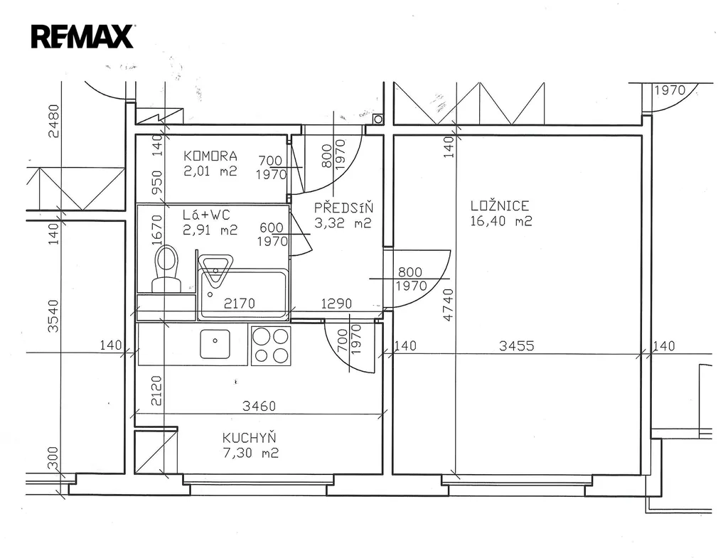 Byt je situován do 1. NP panelové budovy, a jeho celková podlahová plocha činí 34,8 m2.