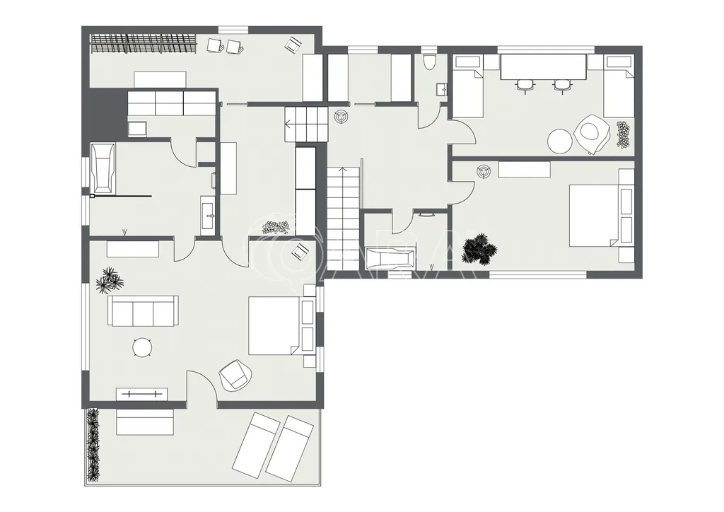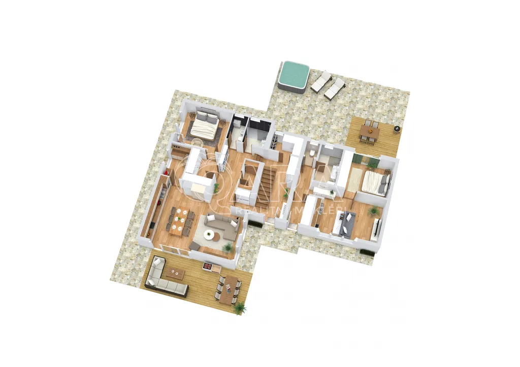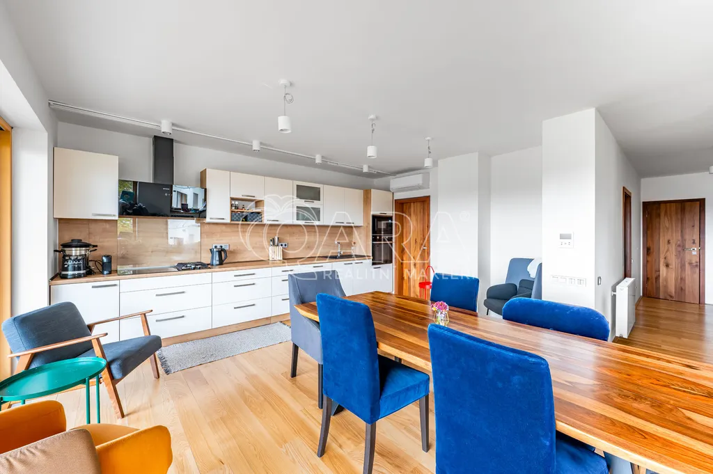 Vila disponuje prostorným přízemím, které nabízí elegantní kuchyň s obývacím pokojem a výstupem na jižní terasu, dále se zde nachází jeden pokoj, 2x šatna, 2x komora, koupelna a toaleta. V prvním patře najdete prostornou ložnici s terasou s nádherným výhledem, vlastní koupelnou se saunou. Další dva pokoje, koupelnu s vanou a sprchovým koutem a samostatnou toaletu. V suterénu domu je prádelna, dvě technické místnosti a sklad.
