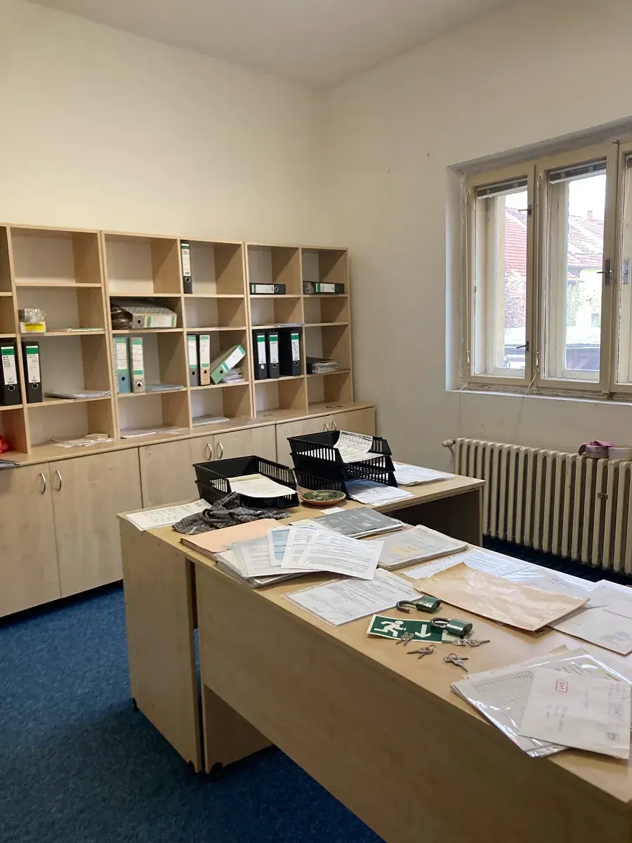 Dům je v dobrém stavu určen k úpravám dle potřeby. Vjezdními vraty se prochází do vstupní haly, kde jsou umístěny měřiče el. a dále je tu vstup do dvou přízemních (se zamřížovanými okny) jednotek: bytová jednotka 1+1 ( 50m2) - prázdná, a nebytová - fungující ordinace veteriny ( 60m2). Po schodech je vstup do kanceláří v 1.patře, možno dispozičně rozdělit na 2 jednotky. Zde je 5 místností s velkými okny - původní špaletové, vytápění - plyn. kotel, kuchyňky, WC v mezipatrech do přízemí a na půdu. Půda vysoká 6m, krov ve velmi dobrém stavu - možnost půdní vestavby, střešní kratina plechová. Dům již neužíván kromě ordinace v přízemí, nabízí se možnost předělání na bytové jednotky popř. půdní byty. Prodej formou dražby dne 23.2.na portále Drazby-Prost.