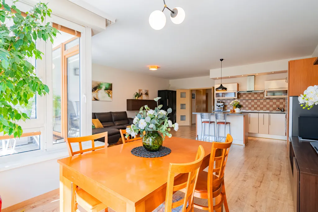 Prostorná dispozice: obývací pokoj se vstupem na lodžii s kuchyňským koutem, tři ložnice, komora i šatna u jedné z ložnic.