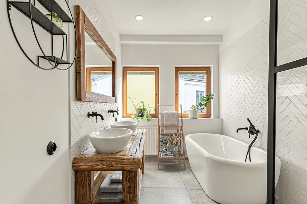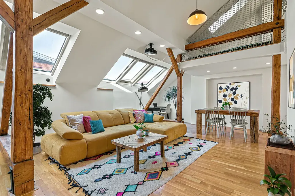 Vstoupíte – a okamžitě víte, že tento byt je jiný. Vysoké stropy, masivní trámy a světlo proudící střešními okny vytvářejí jedinečný prostor s duší. Když k tomu přidáte soukromou terasu, je jasné, že tohle je bydlení, které se nevidí každý den.