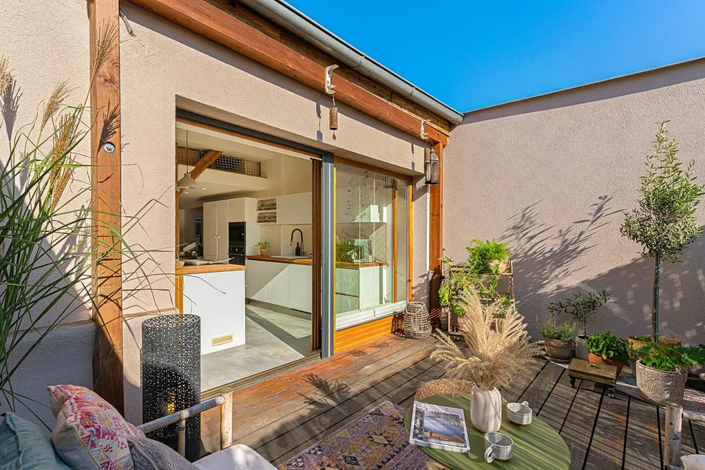 Otevřený obývací pokoj s kuchyňským ostrůvkem je centrem dění – a když budete vařit, stačí se otočit a jste na terase. Zajímavým prvkem je vestavěné patro, kde můžete spát doslova pod oblohou, s výhledem na hvězdy skrz střešní okno. Druhá, samostatná ložnice s výhledem na panorama Nuselského mostu nabízí dostatek soukromí a chytré vestavěné řešení úložného prostoru.