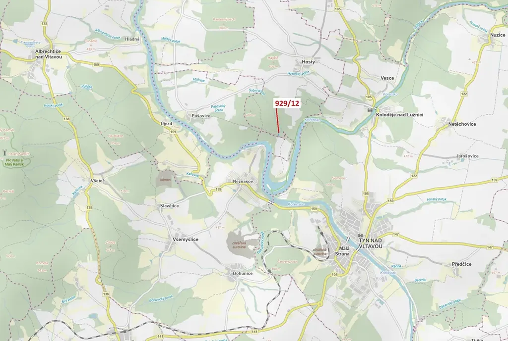 Lesní pozemek o výměře 1517 m2, parcelní číslo 929/12, podíl 1/1, katastrální území Hosty, obec Hosty, obec s rozšířenou působností Týn nad Vltavou, okres České Budějovice, Jihočeský kraj.