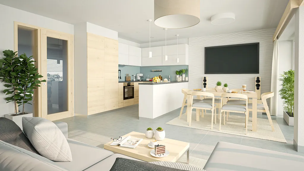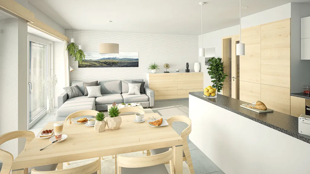 V 1. NP bude obývací pokoj 17,00 m², kuchyňský kout 6,93 m², jídelna 8,74 m², zádveří, hala, sklad a WC.