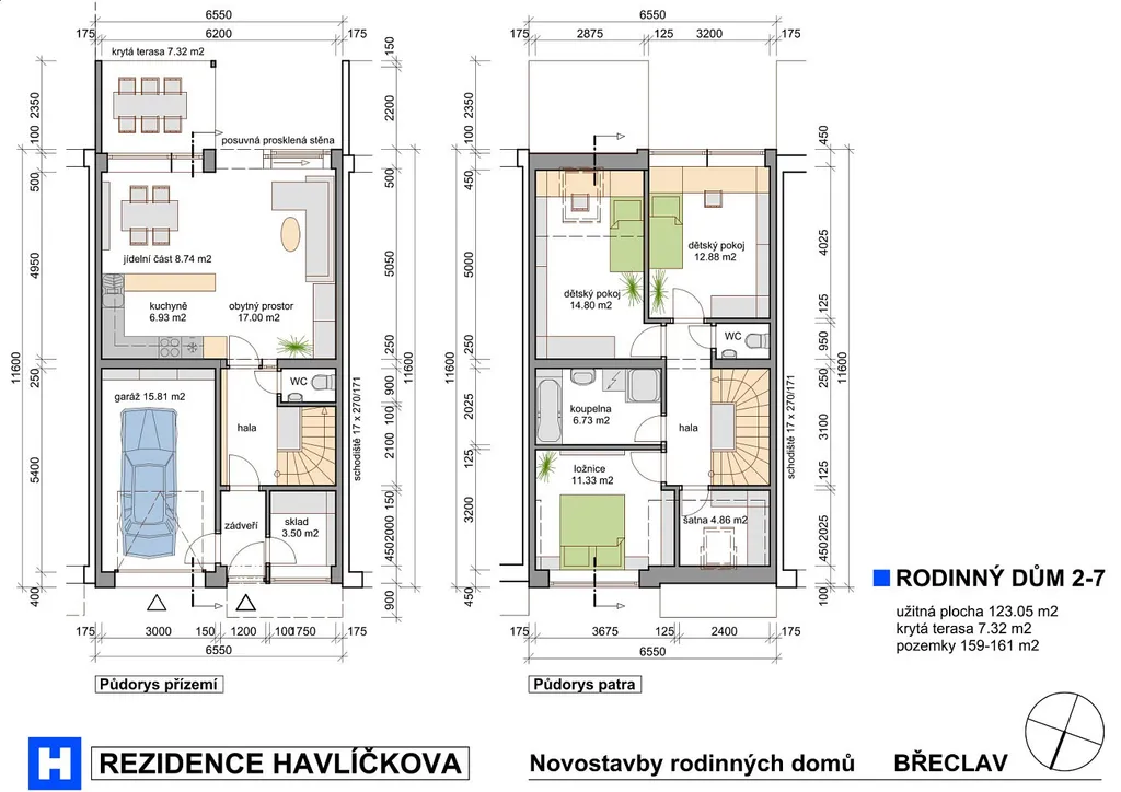 Užitná plocha je 123 m², plocha terasy je 7,32 - 8,00 m², celková výměra pozemku je od 160 do 211 m².