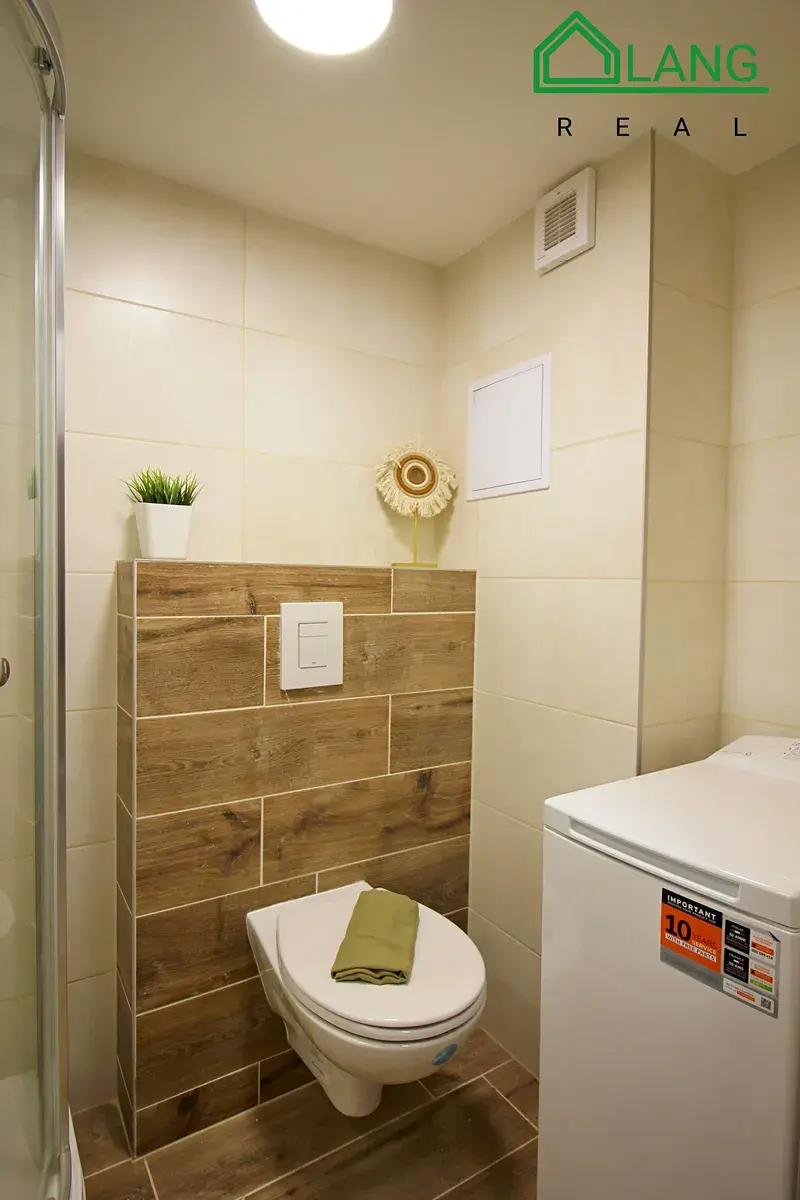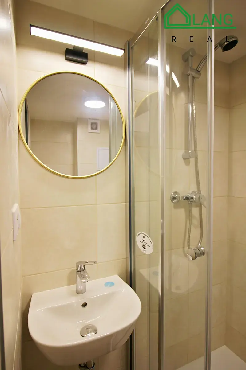 V moderně designované koupelně se nachází sprchový kout, umyvadlo se zrcadlem, toaleta a pračka, vše dispozičně prakticky umístěno.