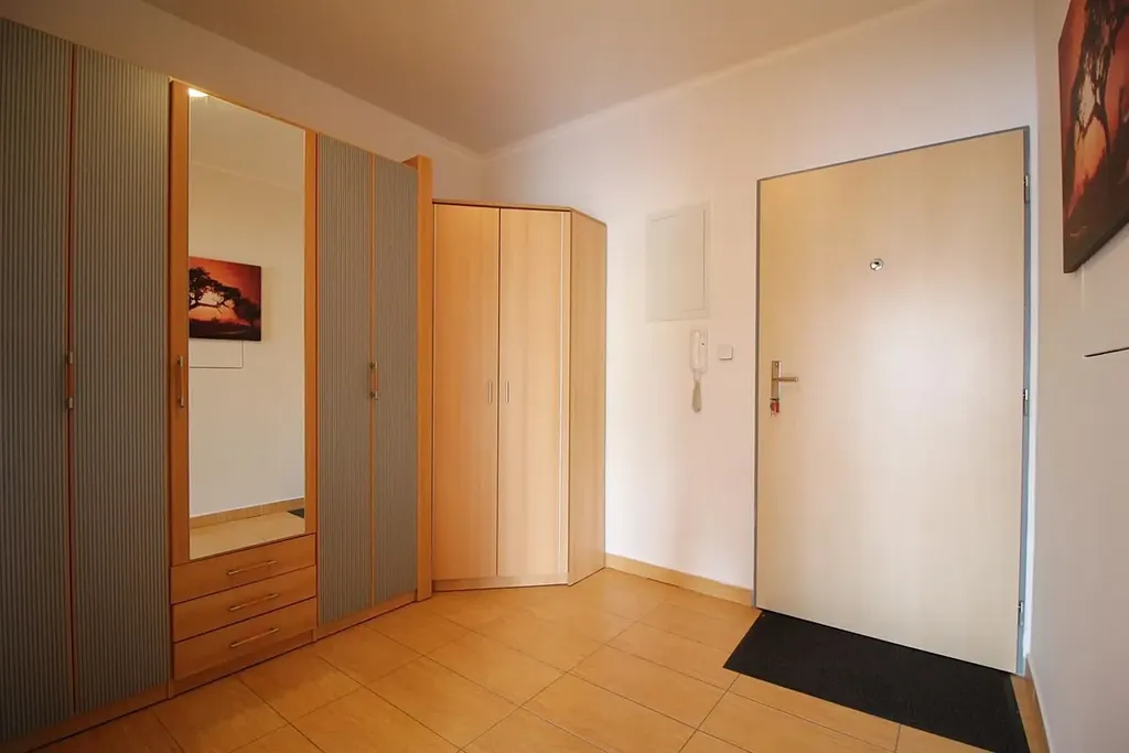 V chodbě je prostorná šatní skříň.