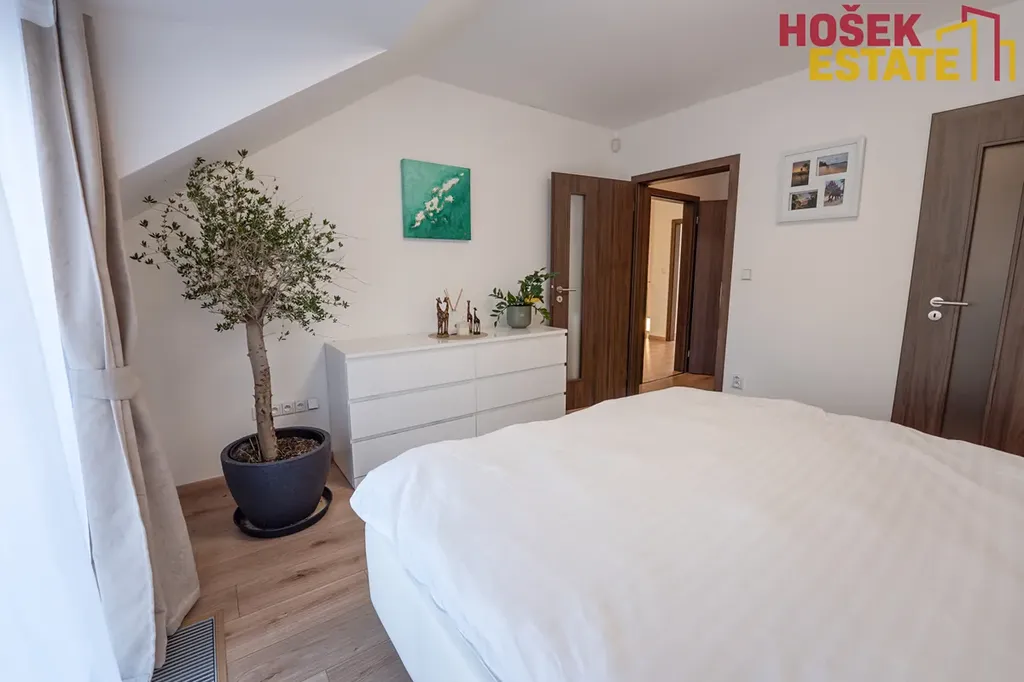 Velmi zajímavě je řešena hlavní ložnice se vstupem přes vlastní šatnu. Aktuálně je u ložnice i druhá šatna, původně to však byla koupelna, kterou zde velmi jednoduše opět vybudujete. Ložnice má i vlastní balkón.