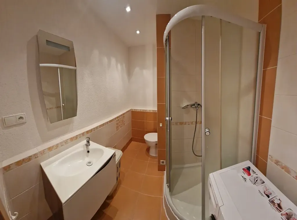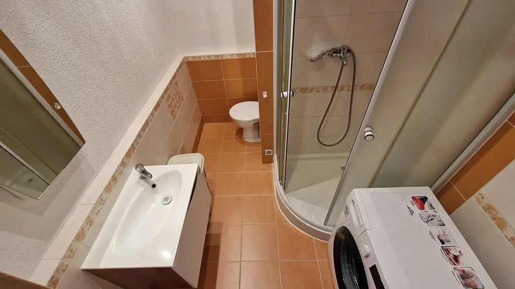 Koupelna je vybavena sprchovým koutem a pračkou. Ohřev vody a vytápění je zajištěno centrálně dálkově. Podlahy jsou plovoucí v kombinaci plovoucí podlahy a dlažby v předsíni.