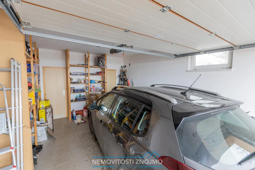 - garáž s automatickými vraty, v zadní části k tomu rozdělená na dvě skladovací místnosti (v garáži zůstávají regály na míru)