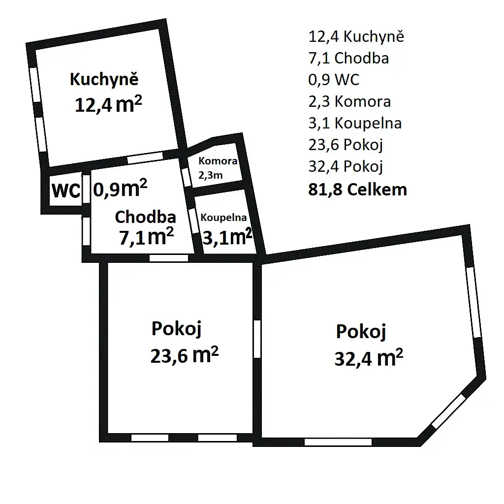 Celková výměra je 81,8m2 + je k bytu prostorný sklep o výměře 12m2.