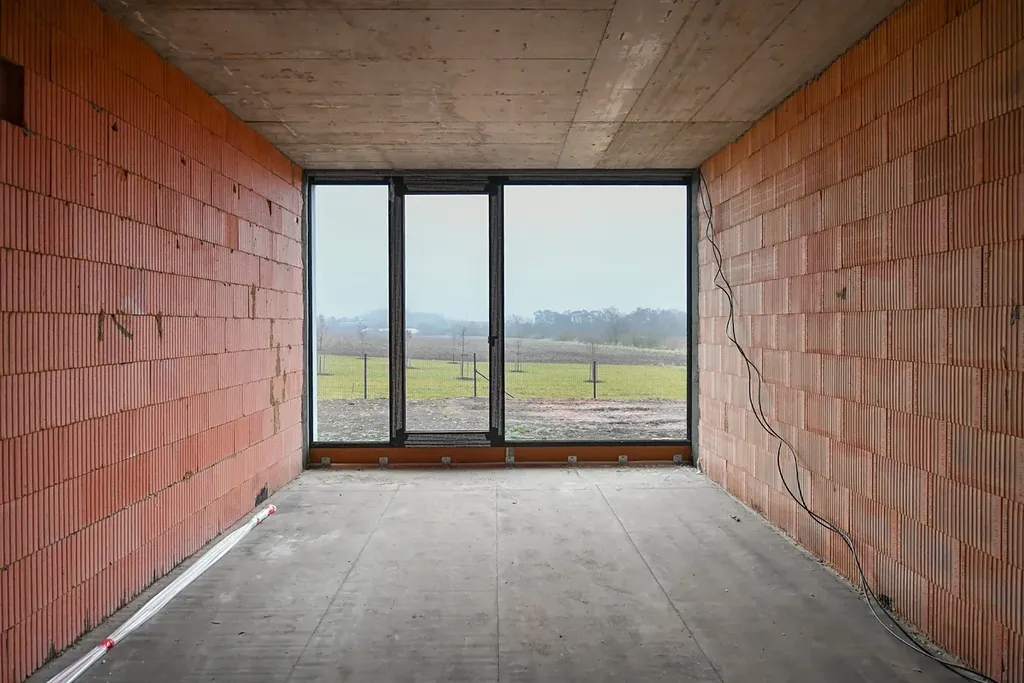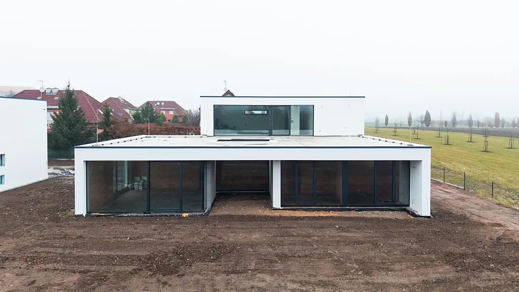 Zděná novostavba je plně zasíťovaná a dokončena s hotovou fasádou i finálními terénními úpravami. Objekt je osazen velkoformátovými hliníkovými okny se stavebně skrytými rámy Schüco s bezpečnostními skly a je připraven na současné technologické standardy moderního bydlení. Aktuálně byly realizovány terénní úpravy pro budoucí zahradu, vybudována příjezdová komunikace, položena žulová dlažba a připravena instalace vjezdové brány. Po kompletním dokončení bude dům splňovat energetickou třídu A.