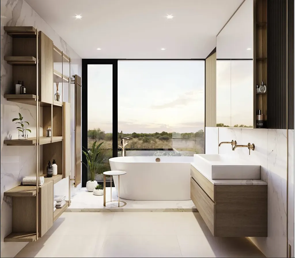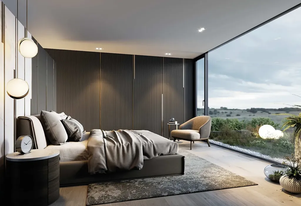 Nemovitost je nabízena ve stavu Shell & Core, který umožňuje budoucímu majiteli přizpůsobit finální podobu interiéru. Hlavní obytné podlaží je koncipováno jako velkorysý otevřený prostor s obývacím pokojem a kuchyní, doplněný o pracovnu, samostatnou toaletu a přímé propojení s garáží i technickým zázemím domu. Bezprahový HS portál přirozeně navazuje obytnou část na budoucí terasu a zahradu orientovanou do volného prostoru. Klidová zóna zahrnuje hlavní ložnici s vlastní koupelnou a šatnou, dva dětské pokoje a samostatnou koupelnu, přičemž ze všech pokojů je zajištěn přímý vstup na zahradu. V horním podlaží se nachází prostorný multifunkční pokoj, pokoj pro hosty, koupelna s toaletou a terasa s plánovanou zelenou střechou. Obytné místnosti jsou orientovány tak, aby poskytovaly ničím nerušené výhledy do okolní zeleně.