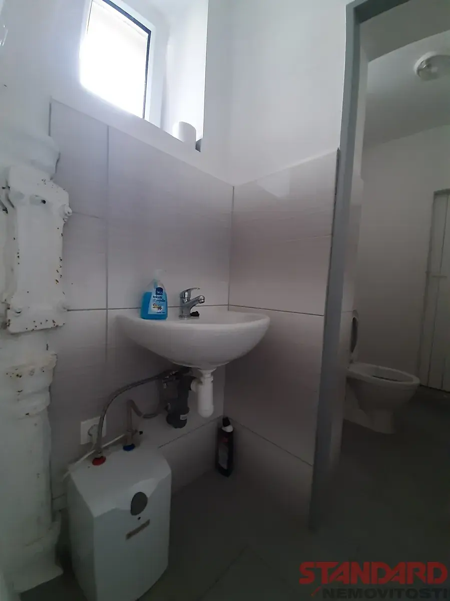 Plastová okna přinášejí dostatek denního světla a zároveň dobré tepelně-izolační vlastnosti. Sociální zázemí je řešeno ve společných prostorách na chodbě přímo naproti kanceláři – k dispozici jsou dvě nově zrekonstruované toalety s umyvadlem, udržované ve velmi dobrém stavu.