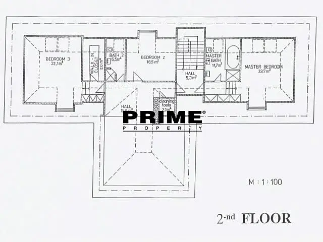 Dům je třípodlažní (suterén, přízemí a podkroví). Dispozice přízemí domu: vstupní hala, velký obývací pokoj (61m2) s krbem, jídelní částí a vstupem na zahradu, plně vybavená kuchyň s kuchyňskou linkou a novými spotřebiči Bosch (sklokeramická varná deska, trouba, myčka, lednice s mrazákem, mikrovlnná trouba a pračka), ložnice pro hosty, pracovna či ložnice, koupelna a samostatné WC. 1. patro: hlavní ložnice s vlastní koupelnou, další dvě ložnice, další koupelna, šatna a komora. Suterén: velká místnost (39m2) (vhodná k využití jako party/TV místnost nebo herna, posilovna či skladová místnost), vinný sklípek a prádelna.