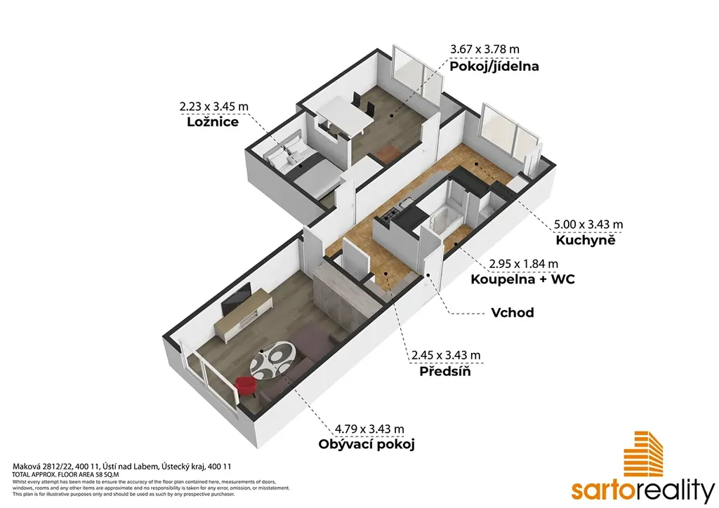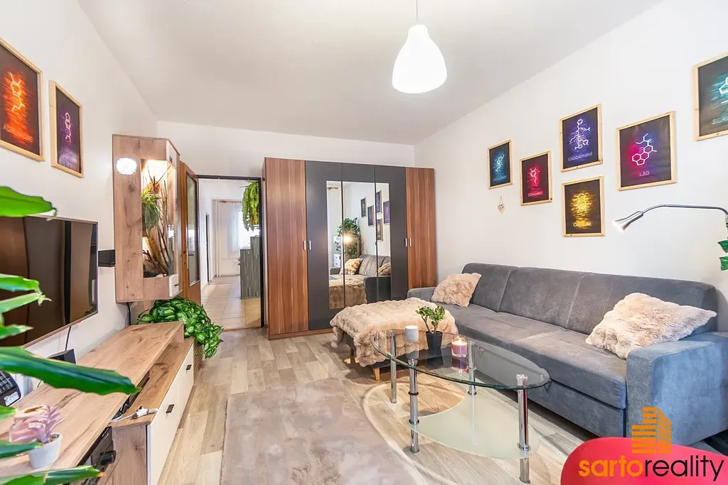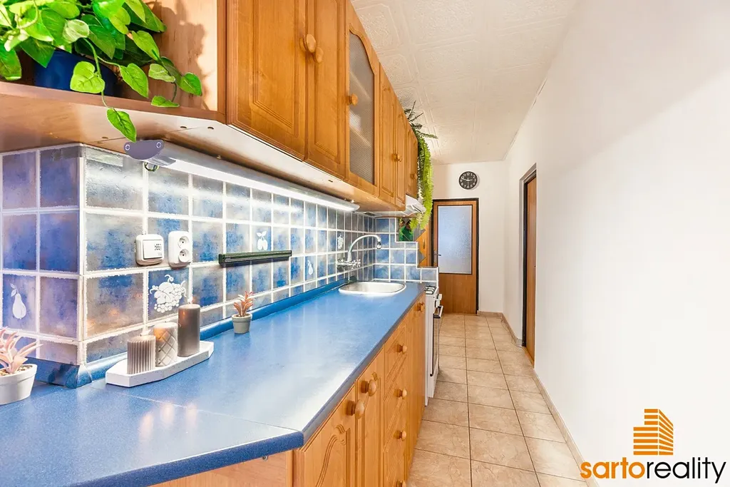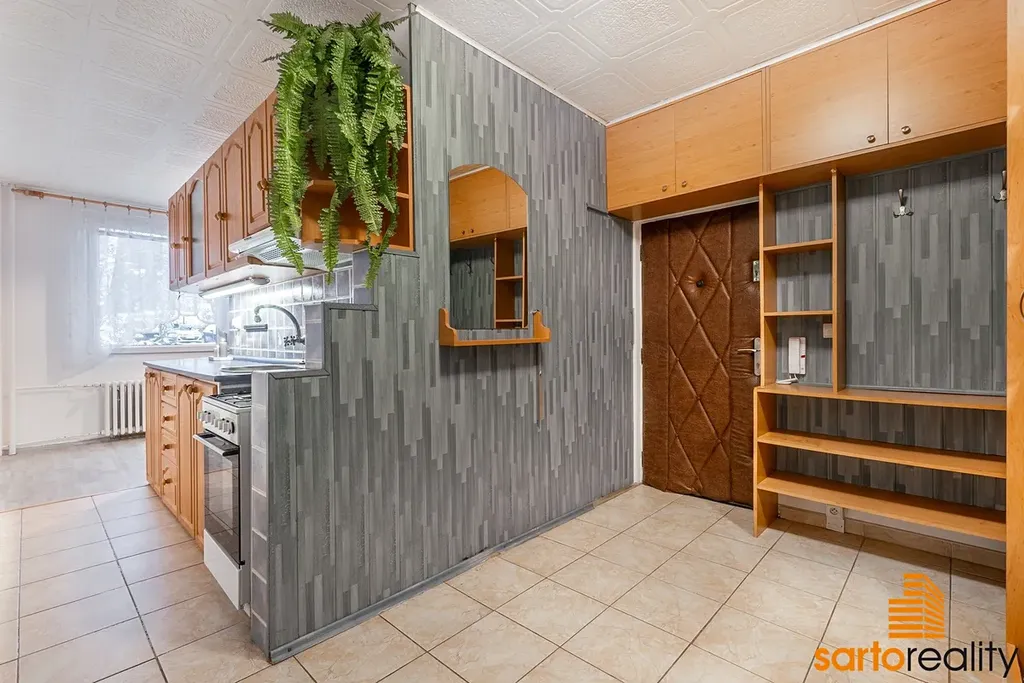Tento byt, o velikosti 60,3 m2 (dle prohlášení vlastníka) je situovaný do 1.NP zrevitalizovaného panelového domu. Skládá se ze vstupní předsíně (7,5 m2), kuchyně (12,4 m2), pokoje (16,4 m2), druhého pokoje (20,4 m2) a koupelny s WC (3,6 m2). k bytu náleží sklepní kóje. Větší ze dvou pokojů byl přepažen příčkou a tak je možné ho vnímat prakticky jako 3+1ku. V minulosti prošel dílčími opravami - pro zmínku koupelnové jádro, rohová kuchyňská linka a další.