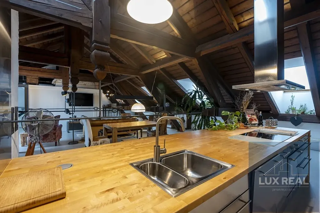 Ve velkém otevřeném prostoru je umístěna kuchyně a obývací pokoj s prosvětlenými střešními okny a vstupem na terasu s krásnými výhledy. Členitost tohoto otevřeného prostoru vytvářejí příjemnou atmosféru a propůjčují mu jas a vzdušnost. Kuchyň je vybavena moderními spotřebiči a splňuje všechny požadavky na funkčnost a komfort při vaření. Po schodech se dostanete na vyvýšený spací kout. V tomto prostoru máte i skříněmi oddělený prostor, kde je koutek sloužící jako pracovna.