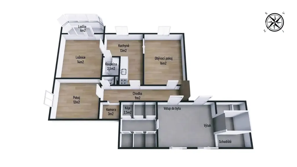 Skladovací kóje přímo na patře a sklepní kóje v suterénu