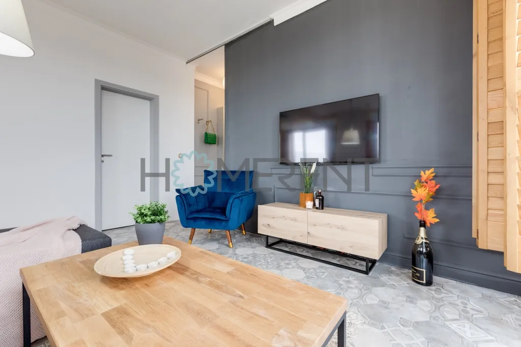 Interiér bytu je promyšlený a působí velmi vzdušně a elegantně. Dispozice zahrnuje prostorný obývací pokoj propojený s kuchyní a jídelnou, hlavní ložnici a druhý pokoj, který je aktuálně nezařízený – lze jej dovybavit dle potřeb nájemce, například jako pracovnu, dětský pokoj, druhou ložnici či šatnu. Součástí bytu je koupelna s vanou, samostatná toaleta, pračka a dostatek úložných prostor.