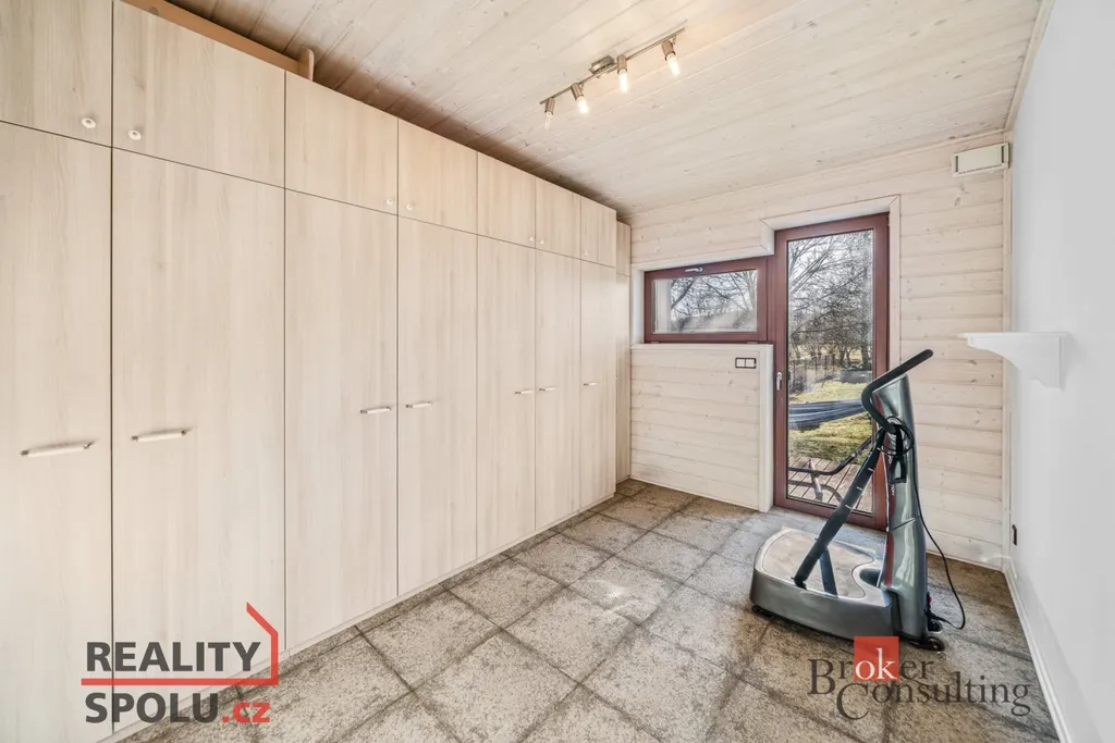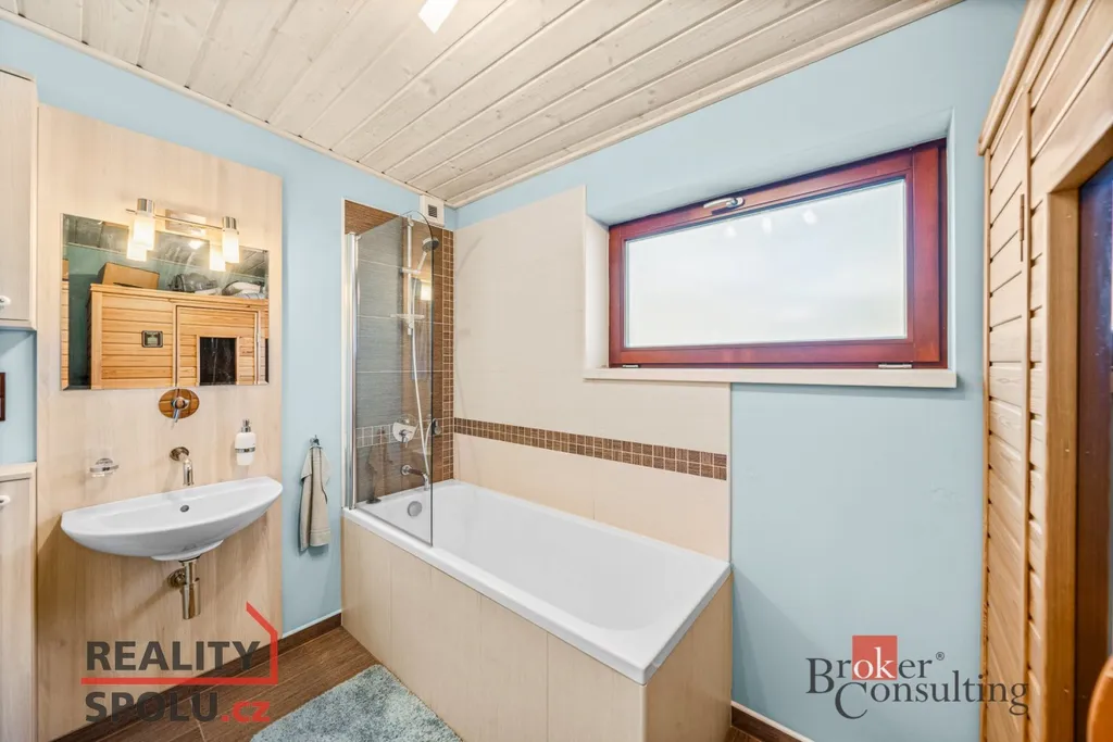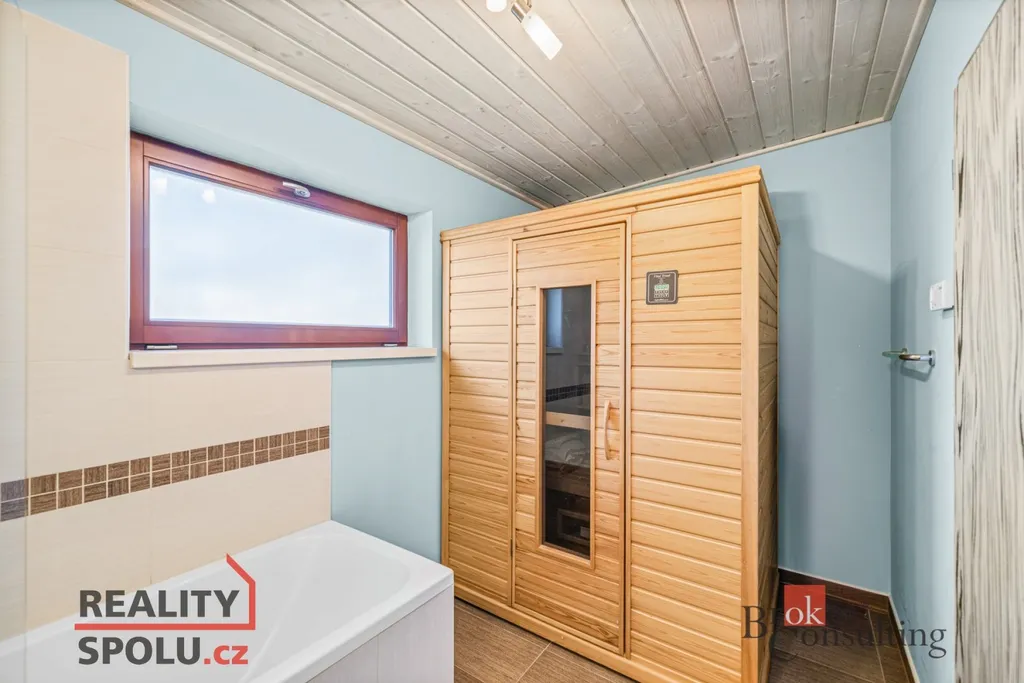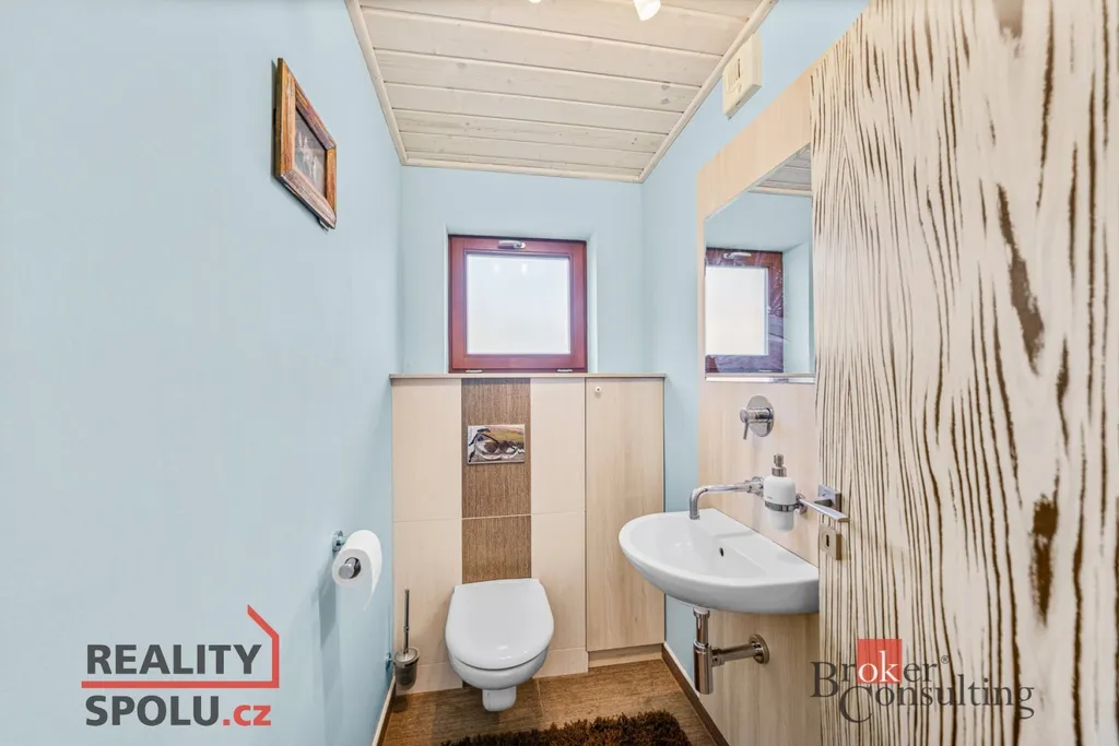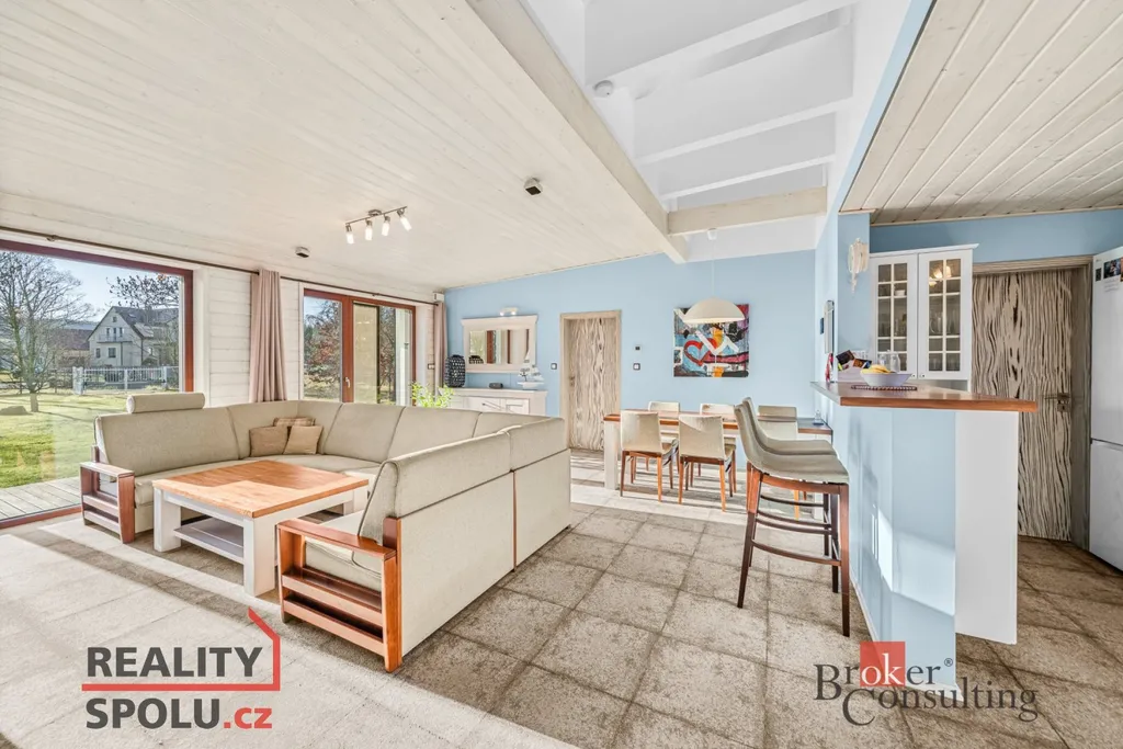 Srdcem domu je velkorysý obytný prostor s kuchyní a jídelnou, plynule navazující na zastřešenou jižně orientovanou terasu – ideální místo pro klidná rána i večerní posezení. Interiér je laděn do jednotného, nadčasového stylu s využitím přírodních materiálů, kvalitních dveří a vestavného nábytku na míru.