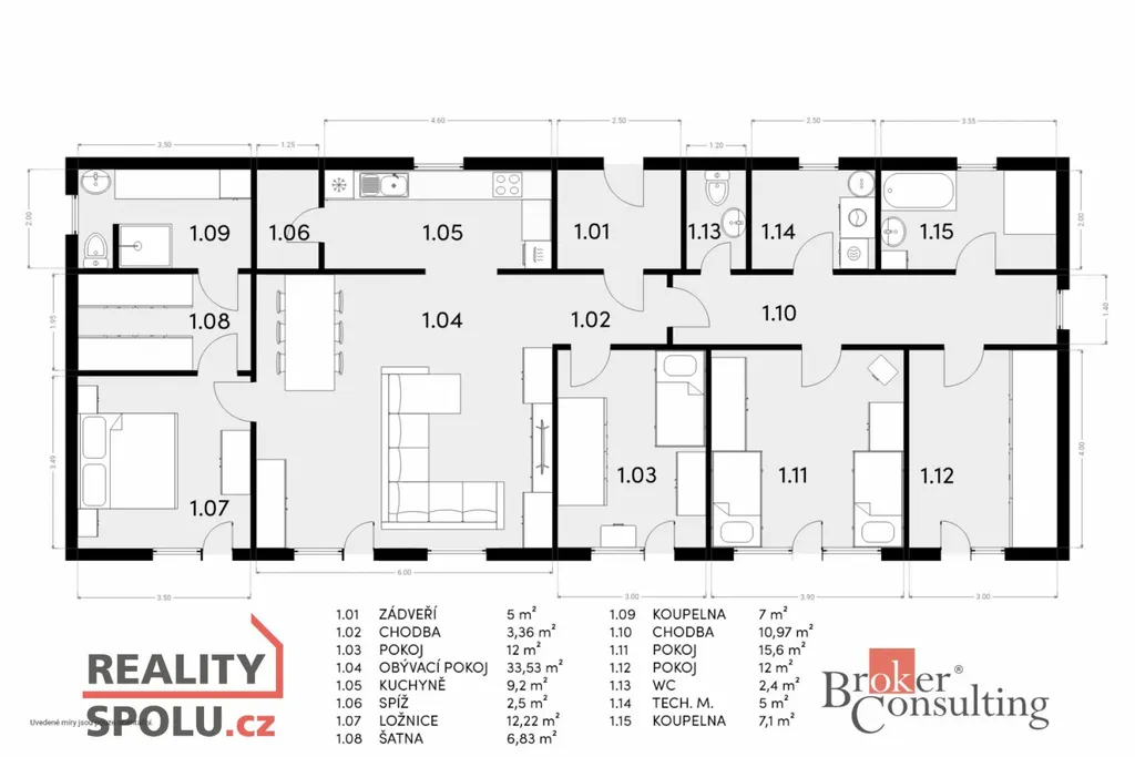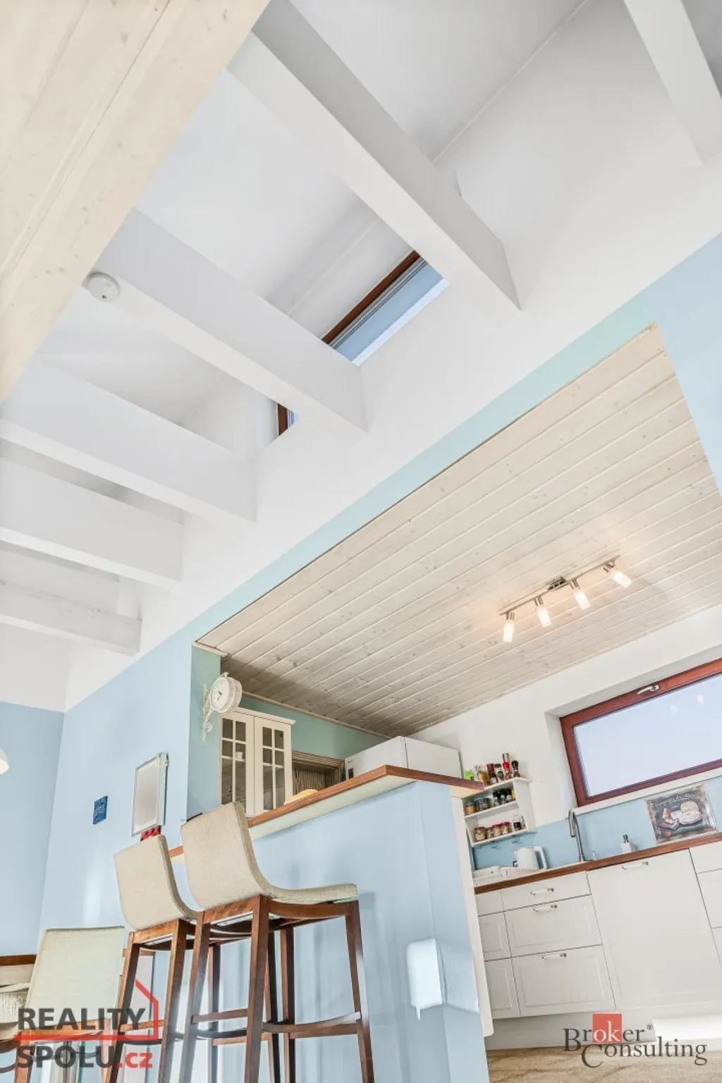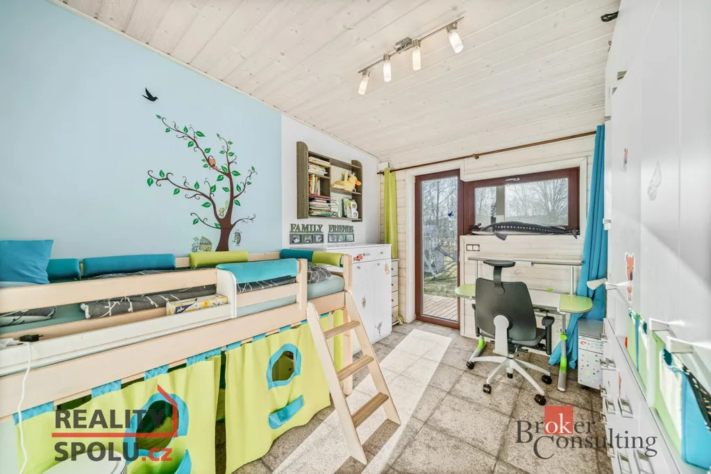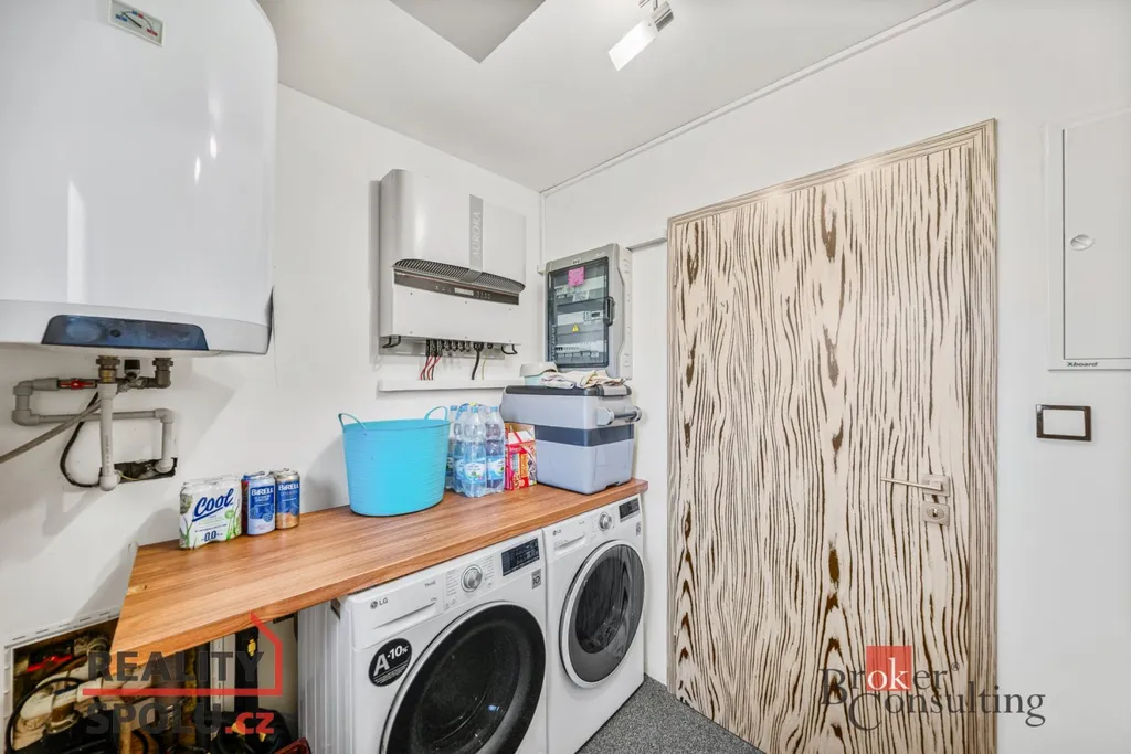 Srdcem domu je velkorysý obytný prostor s kuchyní a jídelnou, plynule navazující na zastřešenou jižně orientovanou terasu – ideální místo pro klidná rána i večerní posezení. Interiér je laděn do jednotného, nadčasového stylu s využitím přírodních materiálů, kvalitních dveří a vestavného nábytku na míru.