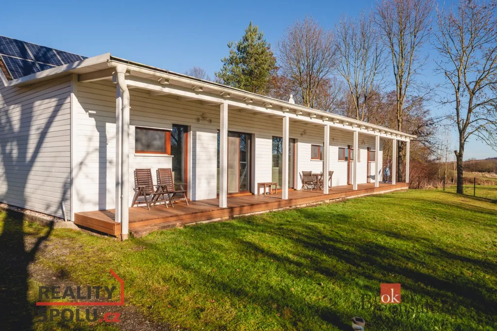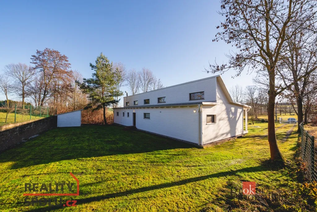 Jednopodlažní vila o dispozici 5+kk a obytné ploše 145 m² je zasazena do rozlehlého pozemku o velikosti 1 523 m² na samém okraji obce, s ničím nerušeným výhledem do zeleně okolních zahrad a luk. Promyšlená orientace ke světovým stranám zajišťuje dostatek denního světla po celý den a přirozené propojení interiéru s exteriérem.