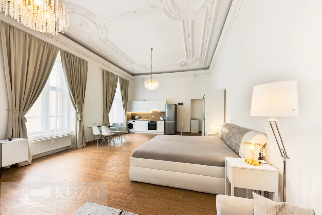 kompletní vybavení: kuchyňská linka s vestavěnými spotřebiči, kvalitní nábytek, křišťálové lustry – byt je připraven k okamžitému užívání.
