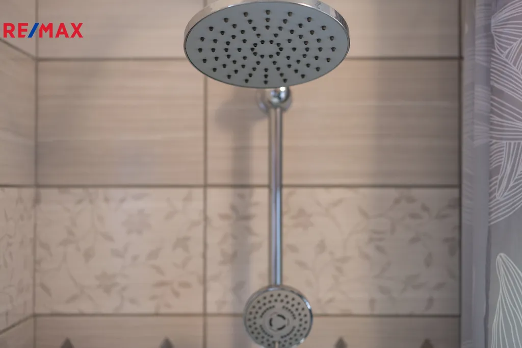 ✅ Koupelna s oknem, s obkladem v béžové barvě, je vybavena podélnou vanou, umývadlovou skříňkou, plynovým kotlem