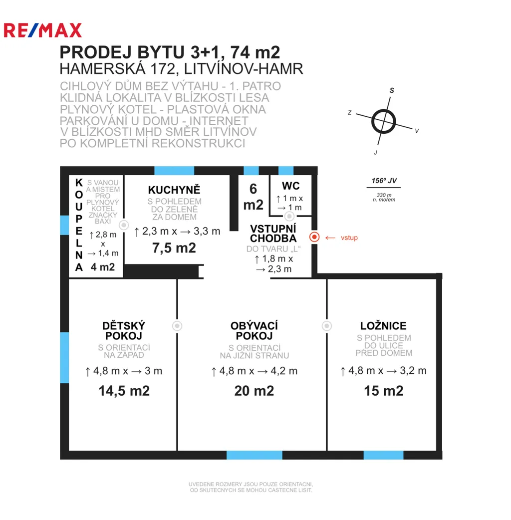 ✅ Dispozice 3+1 | 73,96 m² + sklepní kóje. Otevřený prostor z předsíně do obýváku i do kuchyně působí velmi prostorně a vzdušně a díky jižní orientaci dvou pokojů je byt slunný a teplý.