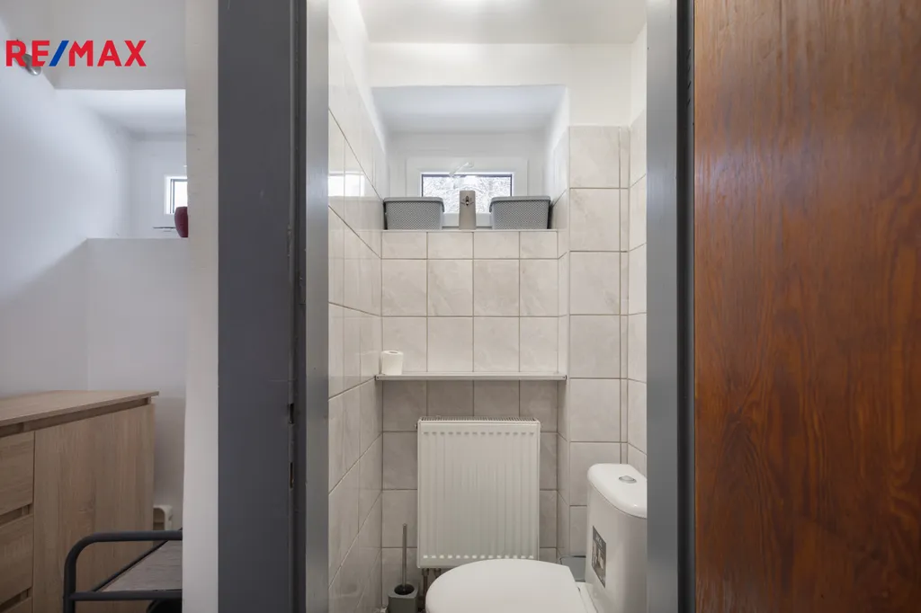 ✅ Koupelna s oknem, s obkladem v béžové barvě, je vybavena podélnou vanou, umývadlovou skříňkou, plynovým kondenzačním kotlem