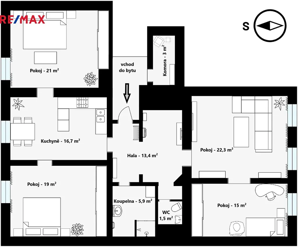 Plocha bytu včetně komory je 117,9 m². K bytu dále náleží možnost využívání sklepní kóje o velikosti cca 4,3 m².