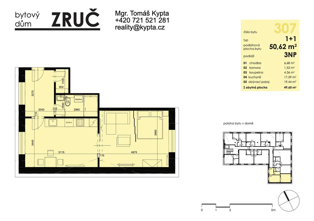 Nemovitost o dispozici 1 + 1 a výměře 50,62 m² se nachází se ve 3. NP budovy. Přístup do bytu je bezbariérový. V ceně pronájmu je již zahrnuto jedno venkovní parkovací stání, přičemž je možnost pronájmu i druhého soukromého parkovacího stání - za 1000,- Kč/měsíc.