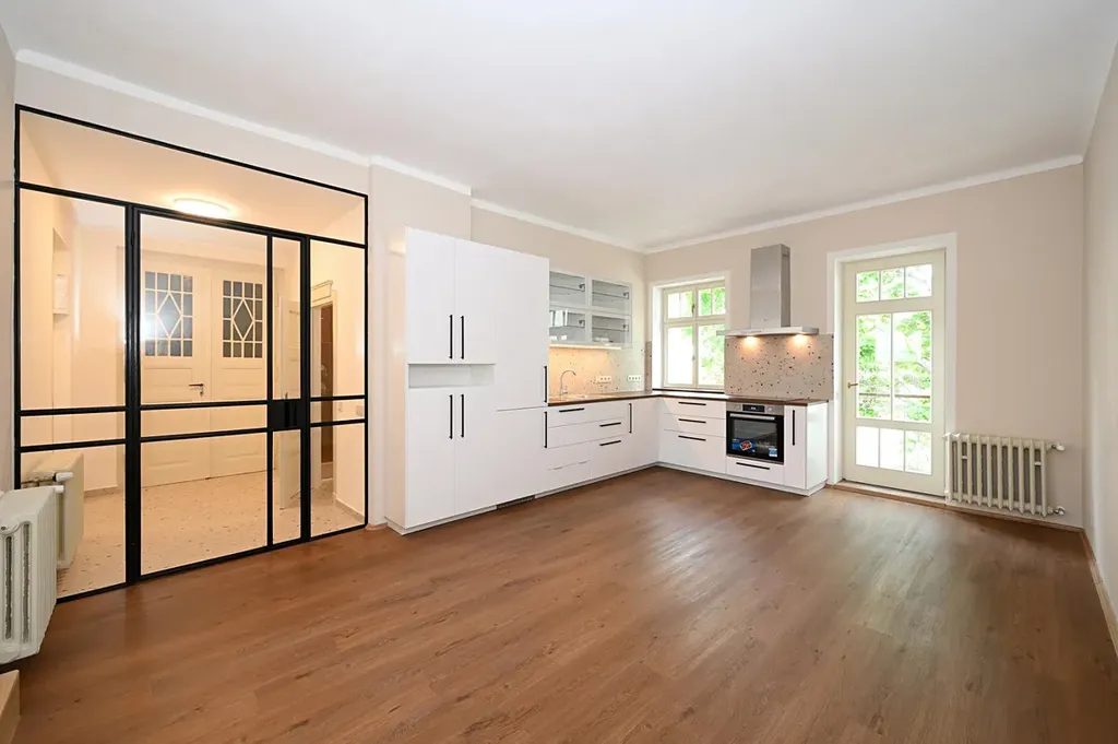 V bytě je obývací pokoj s novým kuchyňským koutem 22,8m2 vybavený všemi moderními spotřebiči, včetně myčky na nádobí, lednice s mrazákem, sporákem a troubou.