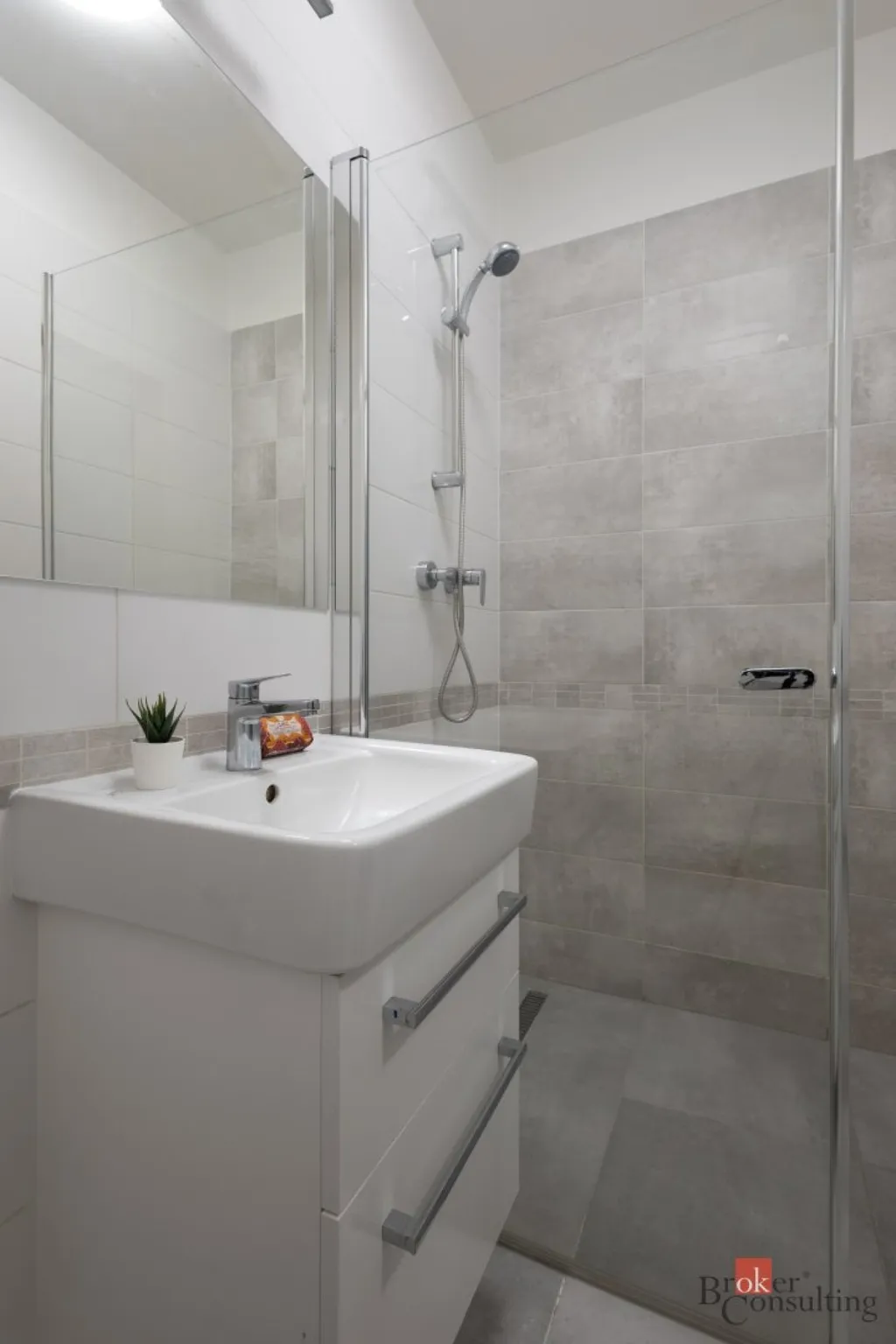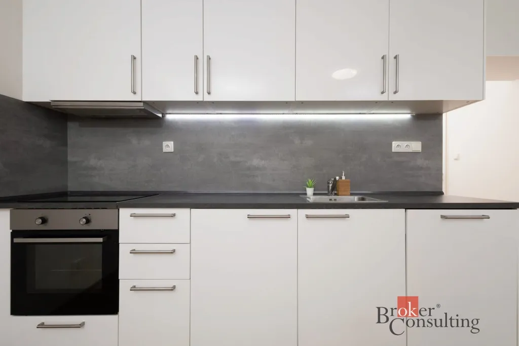 Moderní vybavení: Kuchyňská linka je osazena spotřebiči (indukce, el. trouba, myčka, digestoř). Samostatné WC a moderní koupelna se sprchovým koutem jsou samozřejmostí.