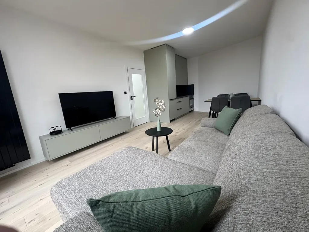 Dispozice zahrnuje obývací pokoj s moderním kuchyňským koutem, samostatnou ložnici, koupelnu se sprchovým koutem a vstupní chodbu s dostatkem úložných prostor.