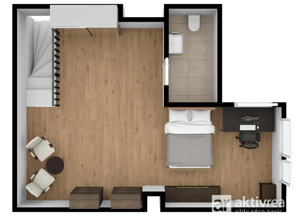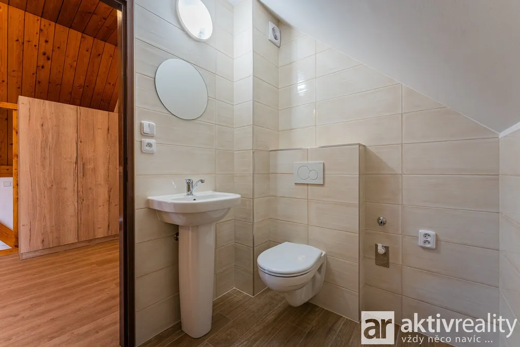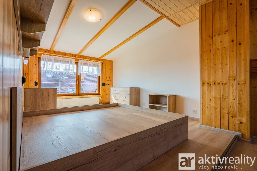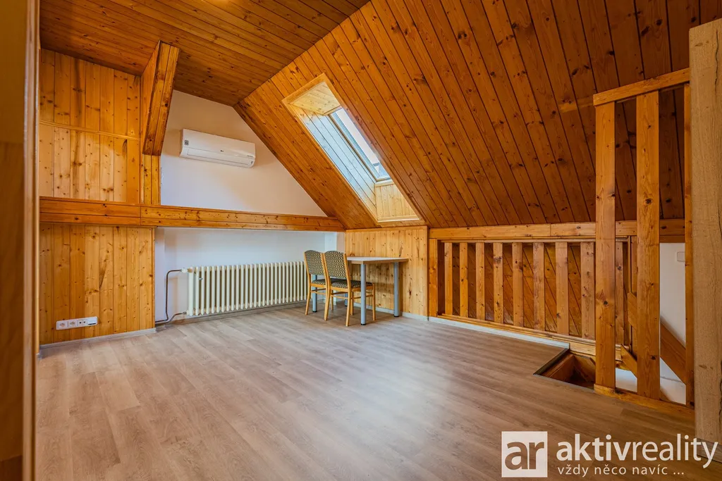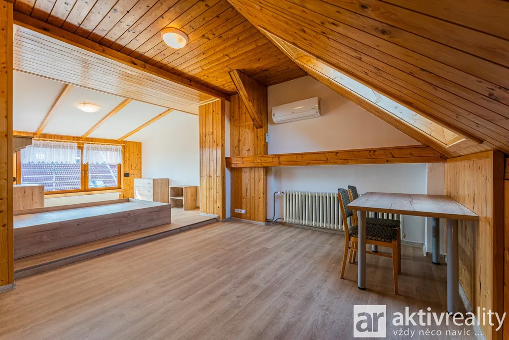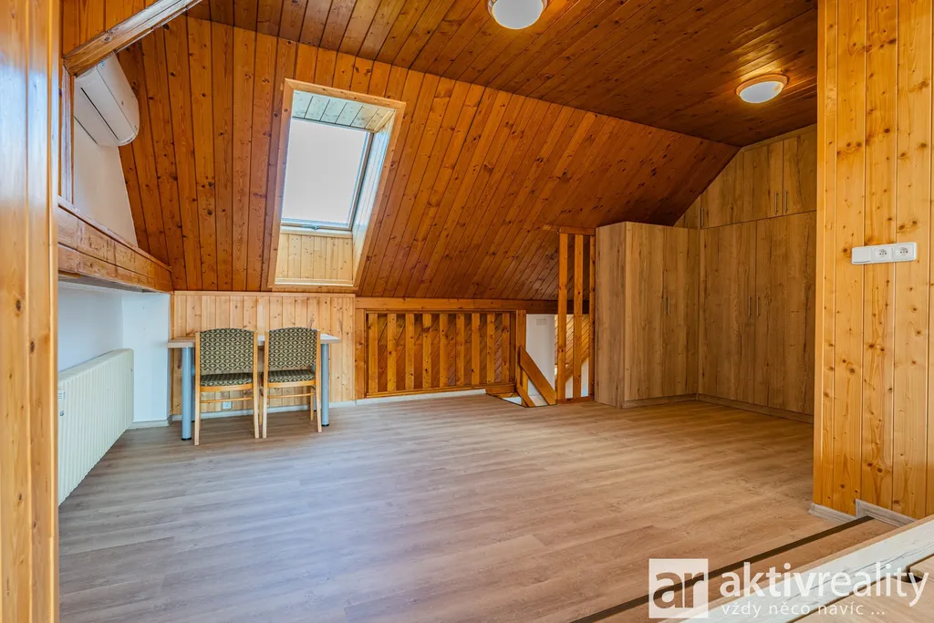 V podkroví se nachází prostorná obytná místnost s možností oddělení klidové části na spaní a samostatné WC. Díky mezonetovému řešení působí byt vzdušně a nabízí dostatek soukromí.