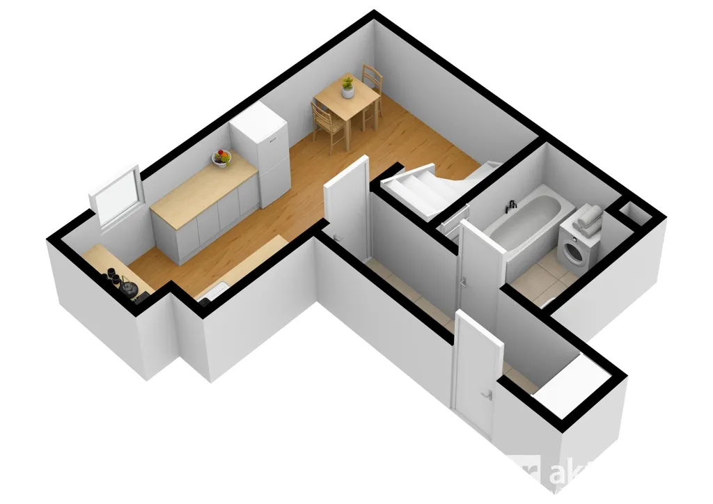 Vstupní úroveň bytu tvoří chodba, koupelna s vanou a WC a světlá místnost s kuchyňským koutem. Kuchyně je plně vybavena spotřebiči – sporákem, troubou, lednicí s mrazákem.