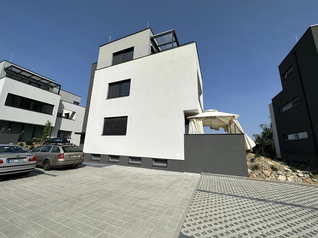 Tento moderní byt je ve 2. nadzemním podlaží a je částečně zařízený - kuchyňská linka se spotřebiči, vestavěné skříně, kompletní osvětlovací technika, klimatizace, venkovní elektrické žaluzie, okenní sítě proti hmyzu, domácí videotelefon, centrální úpravna vody (automatický změkčovač), na podlaze je dlažba. K bytu náleží 2 parkovací stání před domem na oploceném pozemku s možností dobíjení elektroauta a zděný sklep.