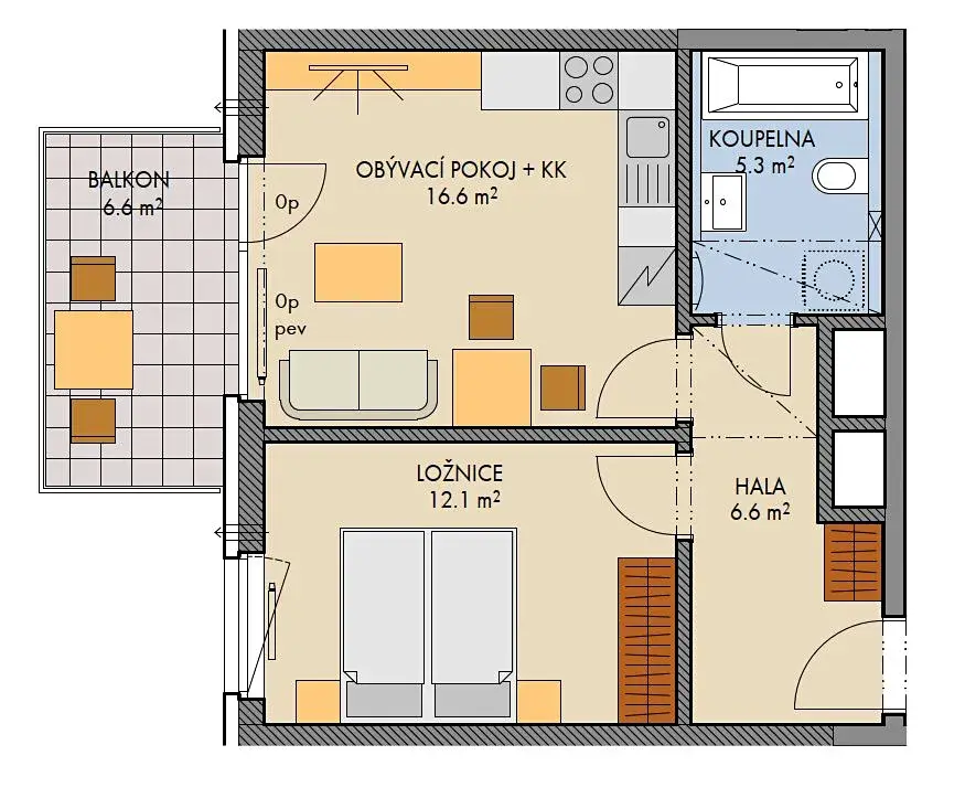 Byt 2kk o velikosti cca 42,3 m2 s nadstandardním balkónem cca 6,6 m2 má západní orientaci a díky umístění v posledním patře nabízí klid, dostatek světla po celý den a daleké výhledy.